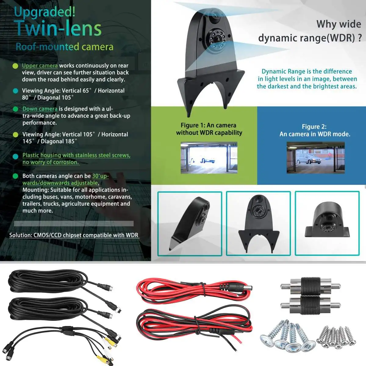 Особенности:-Передняя камера будет включена во время обычного вождения.-Вторая камера будет включена во время парковки.-Водонепроницаемая, камера полностью Погодостойкая с классом IP68.-Отличное ночное видение. Камера имеет 9 инфракрасных ламп, которые обеспечивают обзор даже в темноте.-Разрешение составляет 600 ТВ-линий, что означает, что вы можете получать очень хорошие видеоизображения.