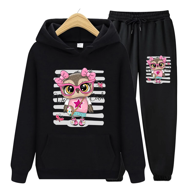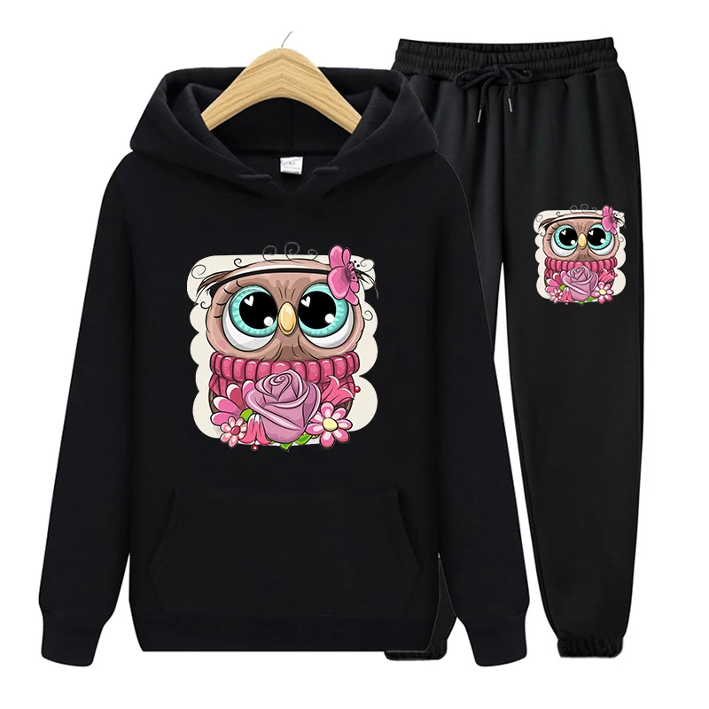 Повседневный комплект из двух предметов с милым мультяшным принтом совы, толстовка с капюшоном в стиле Харадзюку, спортивные брюки с длинным рукавом, женская черная одежда