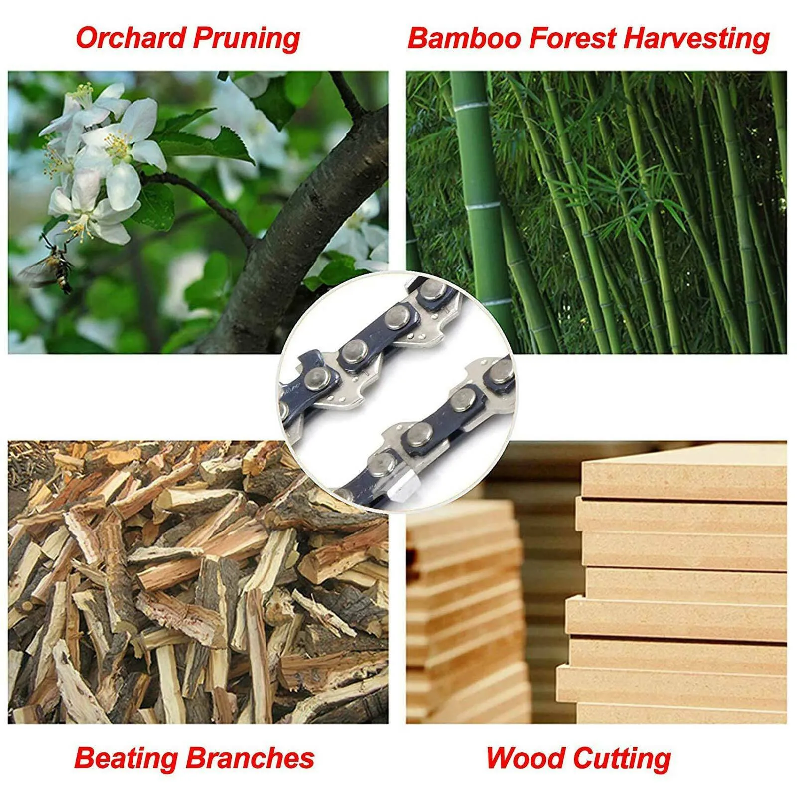 2. Цепь цепной пилы и аксессуары направляющих колес изготовлены из высокоскоростной стали 65Mn, с высокой твердостью, быстрой скоростью нарезки и улучшенной эффективностью.