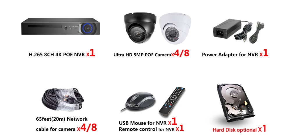 1 сетевой видеорегистратор 8CH 4K POE NVR;4/8 X HD POE IP 5.0MP Крытый Открытый ИК День ночного видения атмосферостойкие камеры;4/8X65 футов (20 м) сетевой кабель для камеры1 X Блок питания для NVR;1 х USB мышь для NVR;1 компакт-диск программного обеспечения для NVR;1 пульт дистанционного управления для NVR;Жесткий диск опционально!