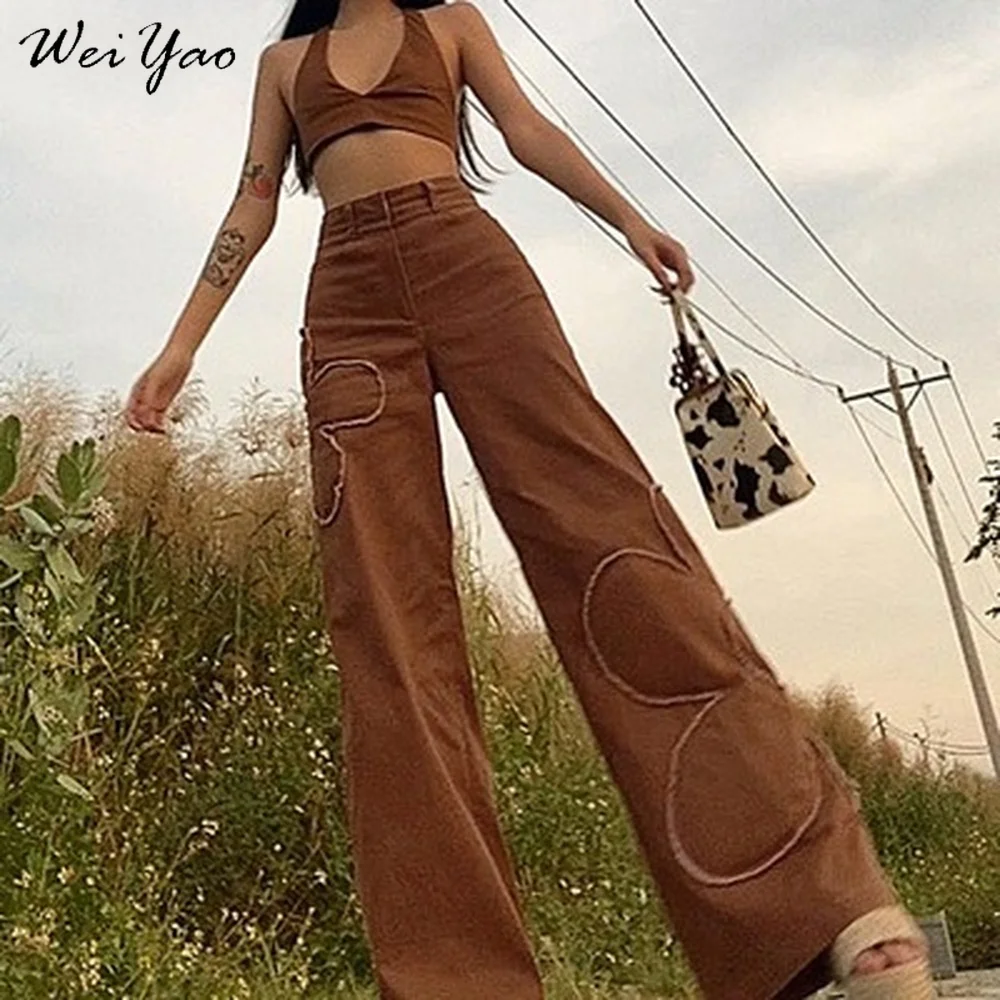 Женские мешковатые джинсы WeiYao Y2K, коричневые винтажные широкие брюки в стиле 90-х с цветочными нашивками, прямые джинсовые брюки с высокой талией, 2021