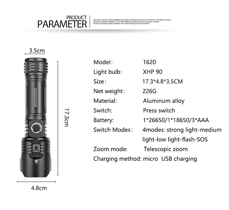 Лампа из бисера Модель: 16-core светодиодныйМатериал линз: оптическая выпуклая линзаРабочая передача: 5 передач (сильный, средний, слабый, быстрый мигание, медленное мигание)Размер изделия: длина 18,8 см, диаметр головки: 5 см, диаметр хвоста 3,6 см, длина 20,8 см, диаметр головки: 5 см, диаметр хвостовой части 3,6 см (длина после расширения)Применимый аккумулятор: 26650x1Класс водонепроницаемости: IPX5 (водонепроницаемый, непромокаемый)Люмены: 5800 люменовМощность продукта: 50 ВтМатериал изделия: алюминиевый сплавРабочее напряжение: 3,7 VЦвет изделия: черныйПрямая зарядка: TYPE-C Прямая зарядка через USB (с выходом и двумя входными интерфейсами)Положение переключателя: переключатель средней кнопкиВес нетто продукта: 470 гДисплей питания: переключатель имеет функцию отображения мощности. Зеленый светильник указывает на достаточную мощность, красный светильник указывает на недостаточную мощность и требует зарядки
