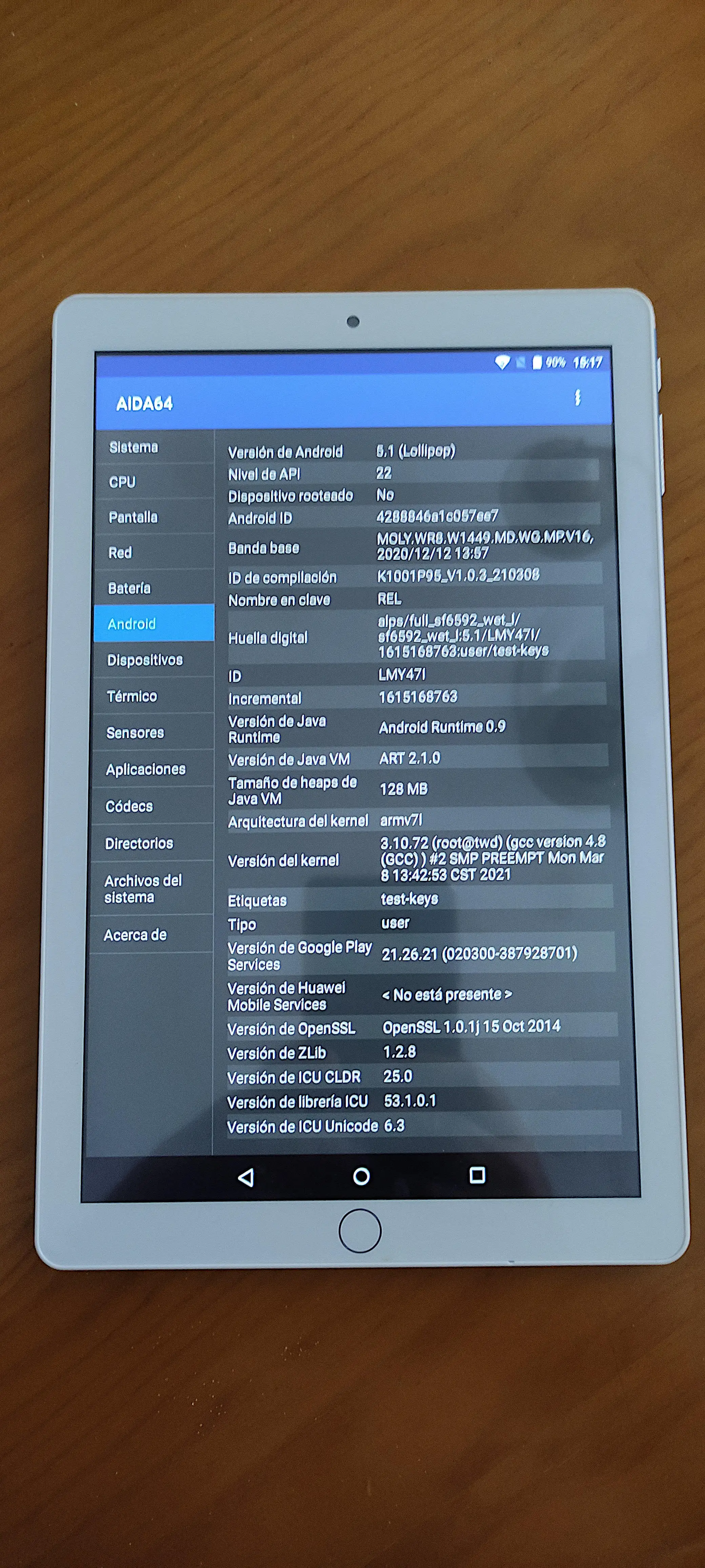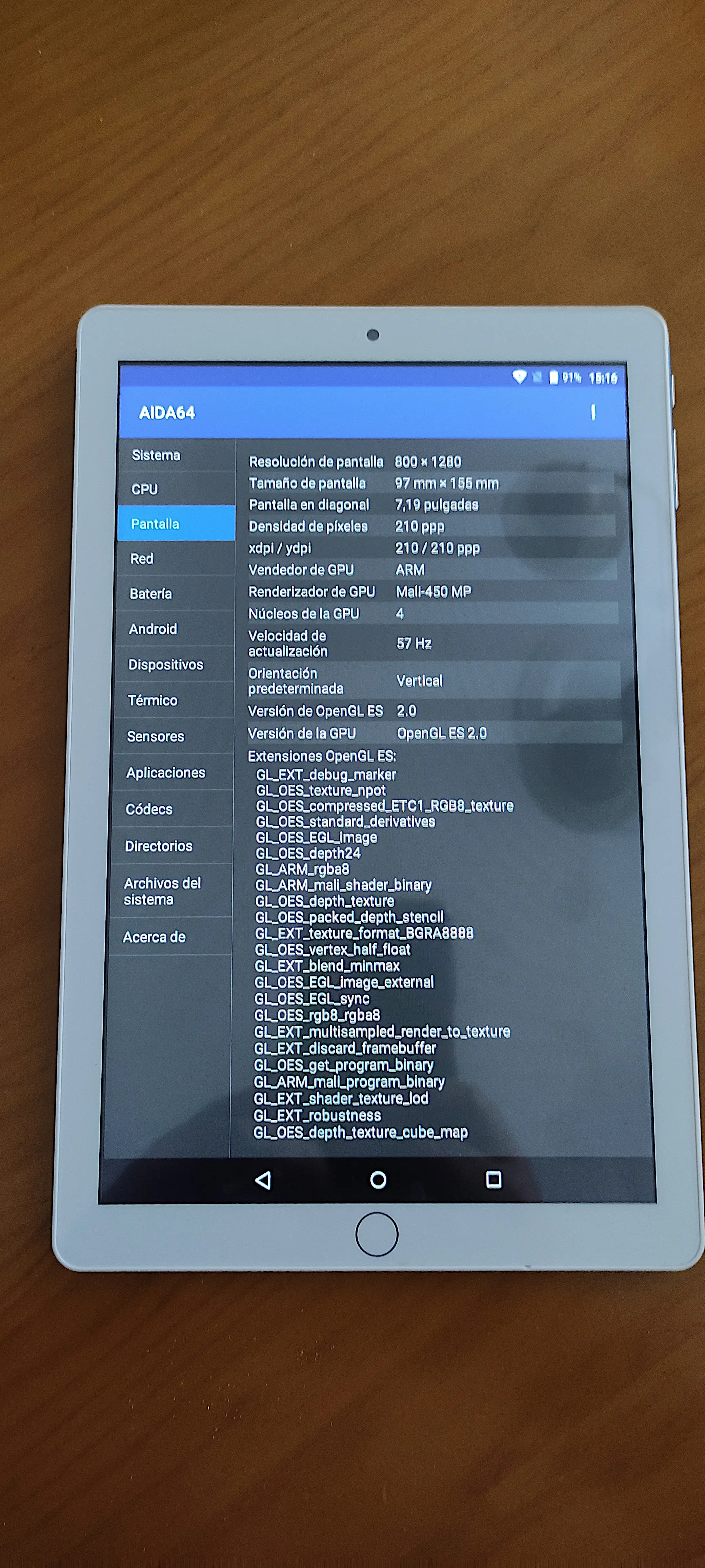 Especificaciones reales del producto CPU: MediaTek MT6592 ARM Cortex- A7 1365 MHz de velocidad Pantalla: Resolución 800x1200 Pixeles con 210 ppp con 57Hz de velocidad Versión de Android: 5.1 Lolipop Batería: 860 mAh. mínimo a 5000 mAh. máximo Mienten, siempre mienten Es un producto horriblemente malo con hardware de hace más de 10 años.