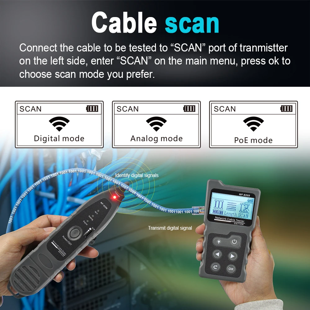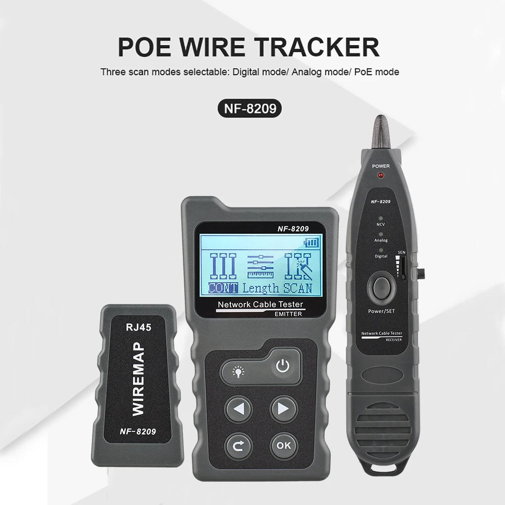 Три режима сканирования переключается: Он имеет цифровой режим, аналоговый и PoE режим для опции для отслеживания кабеля.