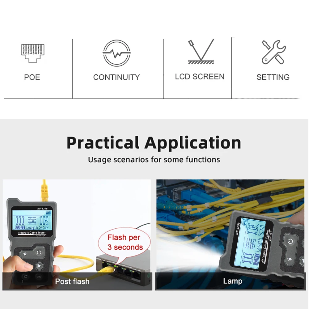 Тестер имеет три режима цифрового режима, аналоговый режим и режим PoE для опции для легкого отслеживания кабеля, что означает, что он оснащен самыми мощными технологиями расположения кабеля для любой рабочей среды. Кроме того, он включает измерение длины кабеля, тестирование неисправностей кабеля, тестирование PoE, мигание концентратора и функцию NCV, все это делает его необходимым инструментом для инженеров-кабельщиков.