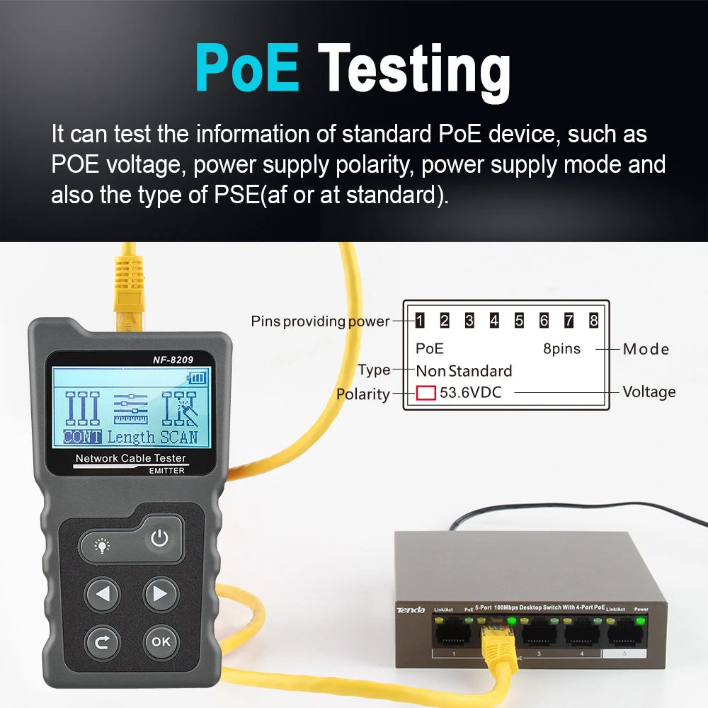 Диапазон тестирования POE: проверьте информацию о стандарте DC5 ~ 60V/нестандартном PoE устройстве.