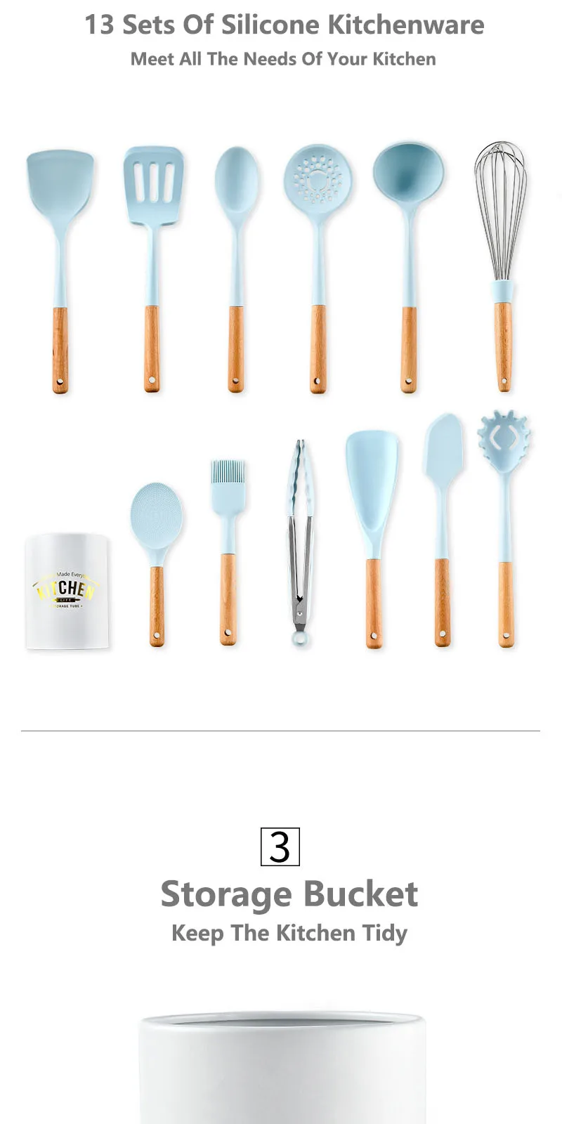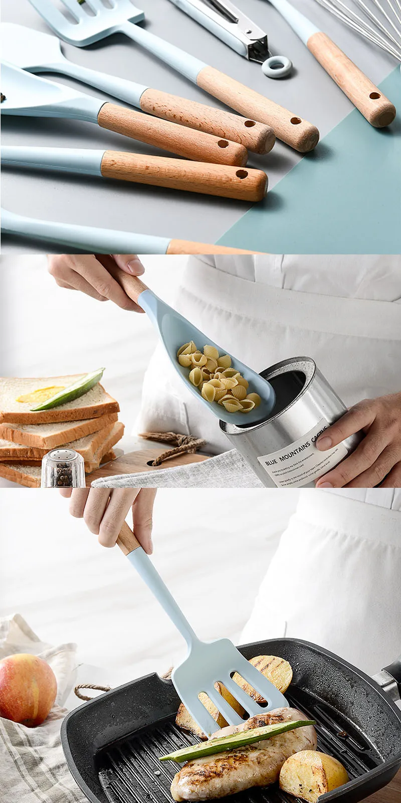 В комплекте: лопатка, кисть для накладки, остроконечная лопатка, токарь с закругленными краями, ковш, токарь с прямыми краями, ложка, щипцы, вилка для макарон и идеально подходит для всех типов продуктов и приготовления пищи.