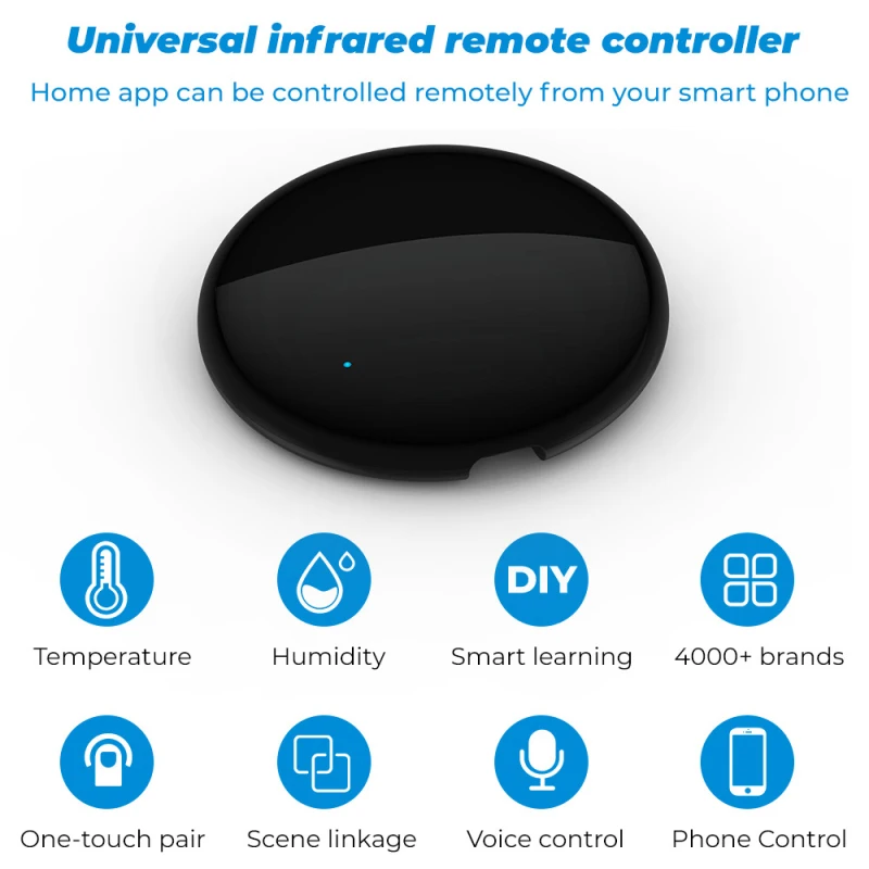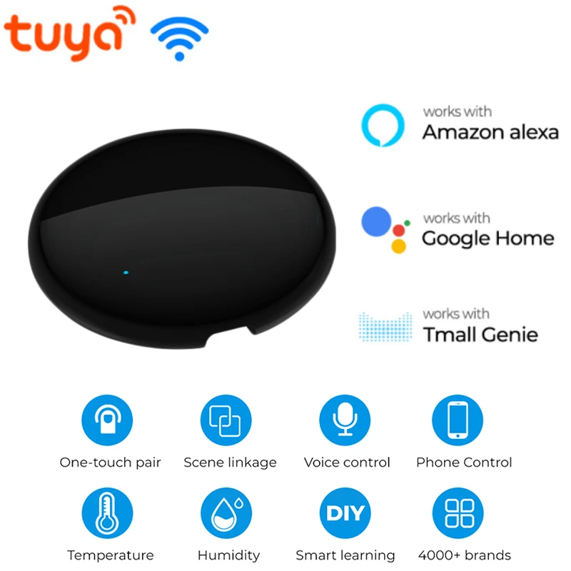 【Голосовое управление Alexa, установите кондиционер на 77 градусов по Фаренгейту. Простая Голосовая команда может активировать контроллер для удаленного управления большинством инфракрасных и радиочастотных устройств управления, таких как кондиционеры, вентиляторы, TV s, DVD, телеприставки, ТВ-боксы и радиочастотные протоколы устройств. (Для более совместимых брендов или устройств, пожалуйста, проверьте список аксессуаров или приложение smart life.)