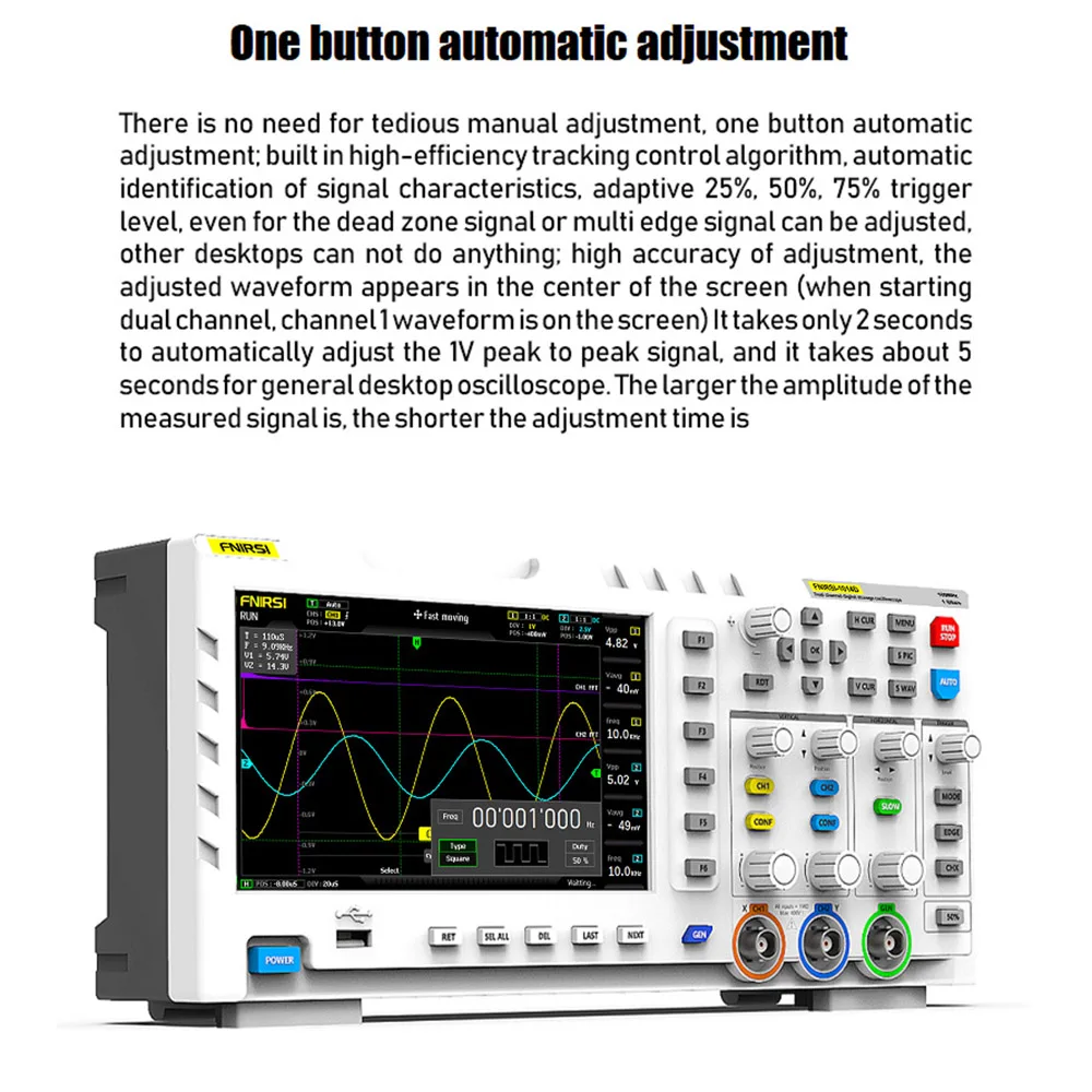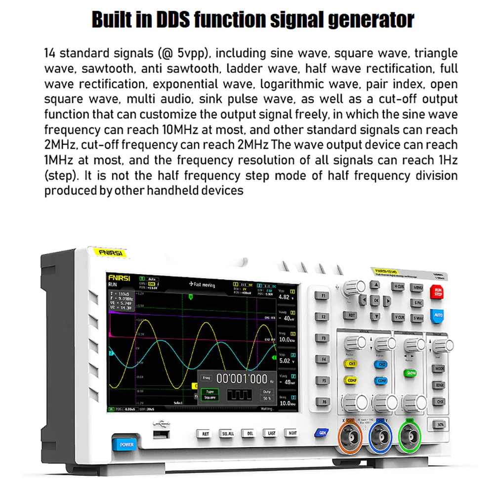 Встроенный генератор сигналов DDS, поддержка 12 видов функционального сигнала.Промышленный оригинальный выходной сигнал позволяет хранить до 1000 сигналов захвата.Целевой Высокоинтеллектуальный алгоритм декодирования, срок службы кодировщика бесконечен.Интеллектуальная защита от ожогов, 1X Выдерживает напряжение до 400 В.100 МГц аналоговая полоса пропускания @ 1GSa/s частота дискретизации (1X = 5 МГц, 10X = 100 МГц).