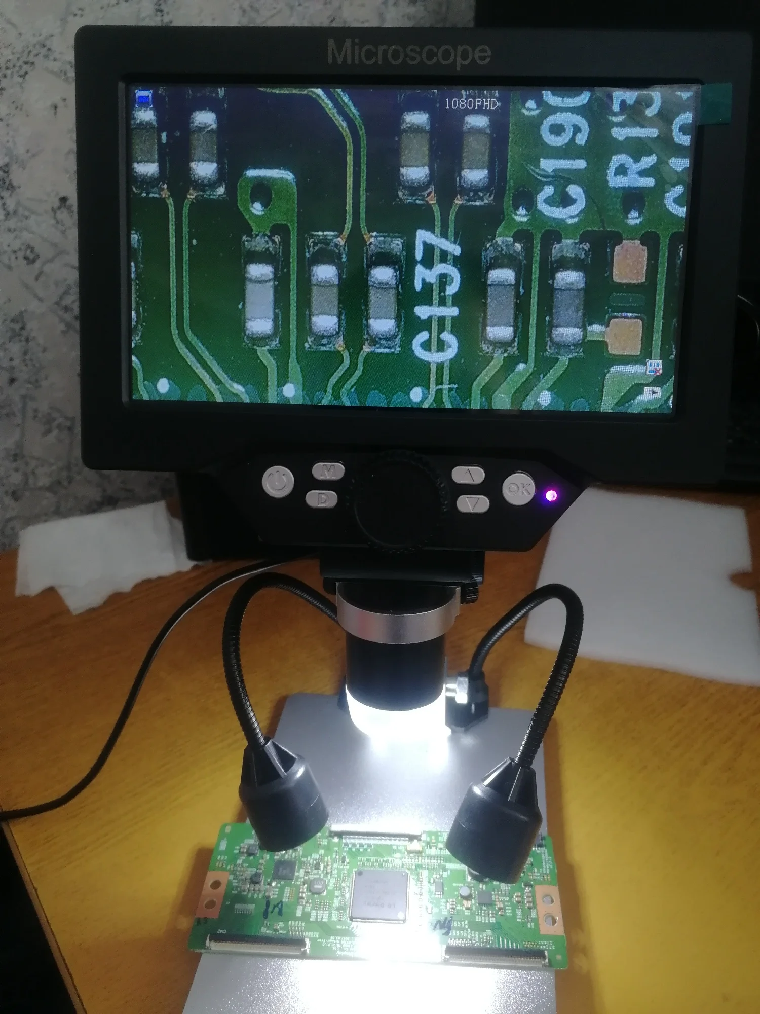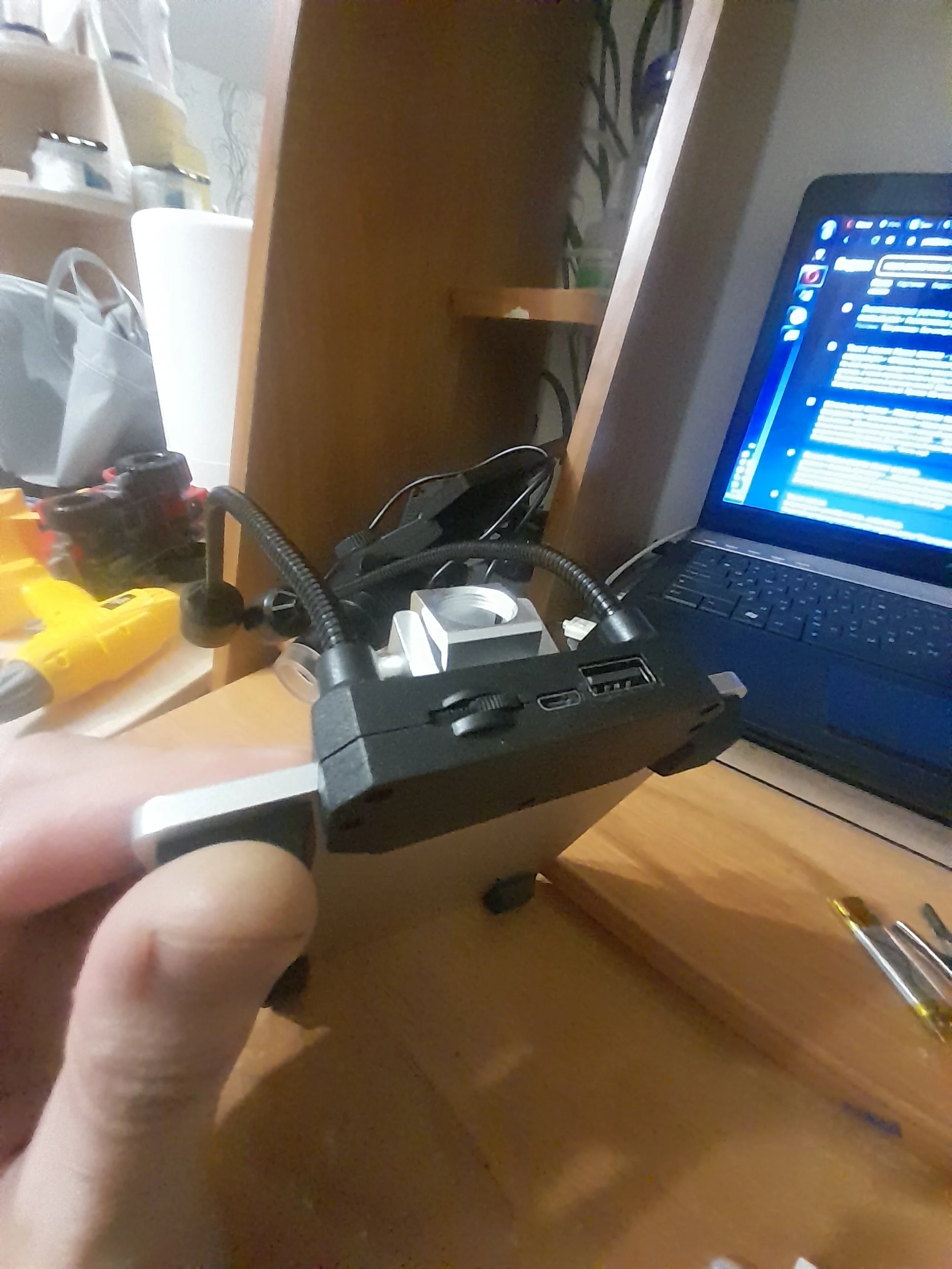 Достввка локальная потому быстро и без повреждений! Аккамулятор в комплекте требует зарядки! Работает хорошо, но увеличений 1200 тут точно нет и быть не может. На мой взгляд, пригодится при ремонте, осмотре пайки, ребоулинга и всему где надо хорошее увеличение, максимум около 100. Думаю для сборки не годится, кроме только если 0201 собираете, тут обычных очков и лупы маловато. Площадка хороший толстый аллюминий, штанга наклоняется, можно и дуть и паяльником подлезть, но повторюсь очки или лупа много удобней! Задержка есть, но минимальная почти не мешает. Выхода на внеший монитор нет и сделать походу будет сложно,, стоит один чип и подключена стандартная матрица, нужно отключать матрицу и колхозить преобразователь, в общем если нужен экран берите с внешним выходом! Текущий экран для сборки маловат, но малый размер и легкость всей конструкции обеспечивает мобильность, достал-убрал! Цена на распродаже со всеми скидками была 5,3 тыс. За эти деньги игрушка полезная!