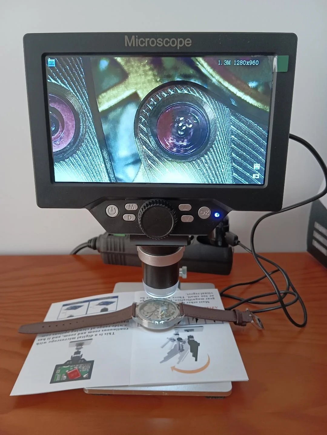 Получил что ожидал. Все как на сайте продавца. 7 дюймовый дисплей, металлическая (дюраль) основание и стойка, две лампы подсветки по бокам. Зарядка, два шнура в комплекте. Был полностью заряжен. Все работает. Отличный микроскоп. Шел с Москвы в Воронеж, пришел быстро.
