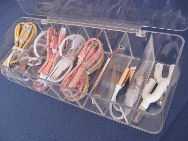 1. Хорошо организовывайте аксессуары для электроники и Попрощайтесь с вашими кабелями. 8 ячеек достаточно для хранения зарядного кабеля, вы также можете положить зарядную головку и bluetooth-гарнитуру.2. Кабели для зарядки легко хранить, легко брать и легко использовать с большим отверстием коробки. Наклейте этикетку, которую легко найти, но также можно заменить в любое время.3. Изготовлен из пластика, полупрозрачная матовая текстура, гладкие детали без заусенцев, прочные и удобные в использовании.4. Благодаря компактному размеру и легкому пластиковому материалу, коробка для хранения идеально подходит для путешествий, подходит для вашего портфеля или багажа, не занимает много места.Спецификация:Материал: пластикРазмер: приложение. 25*8*4,5 см/26*9*5,5 см