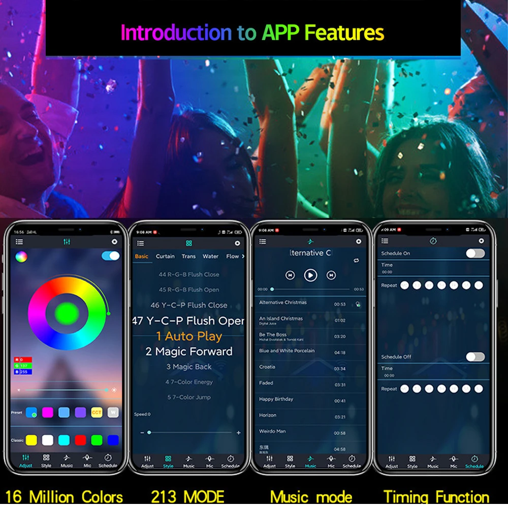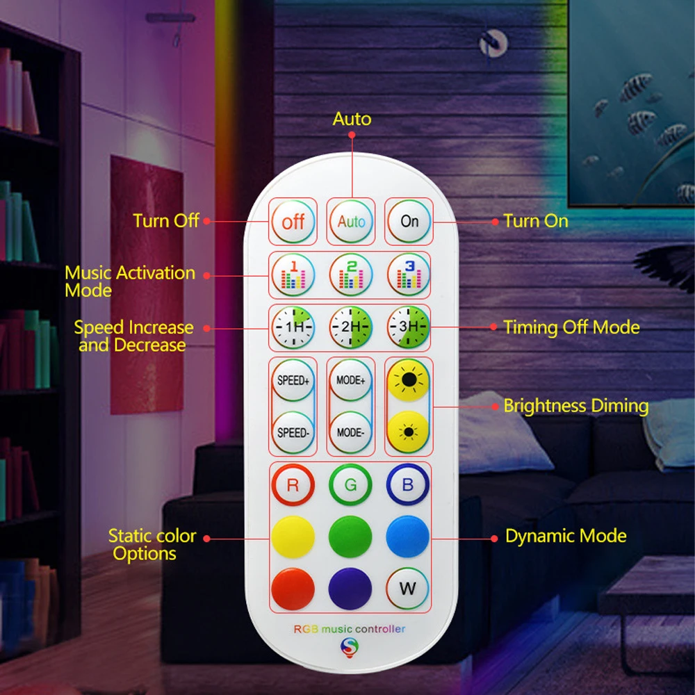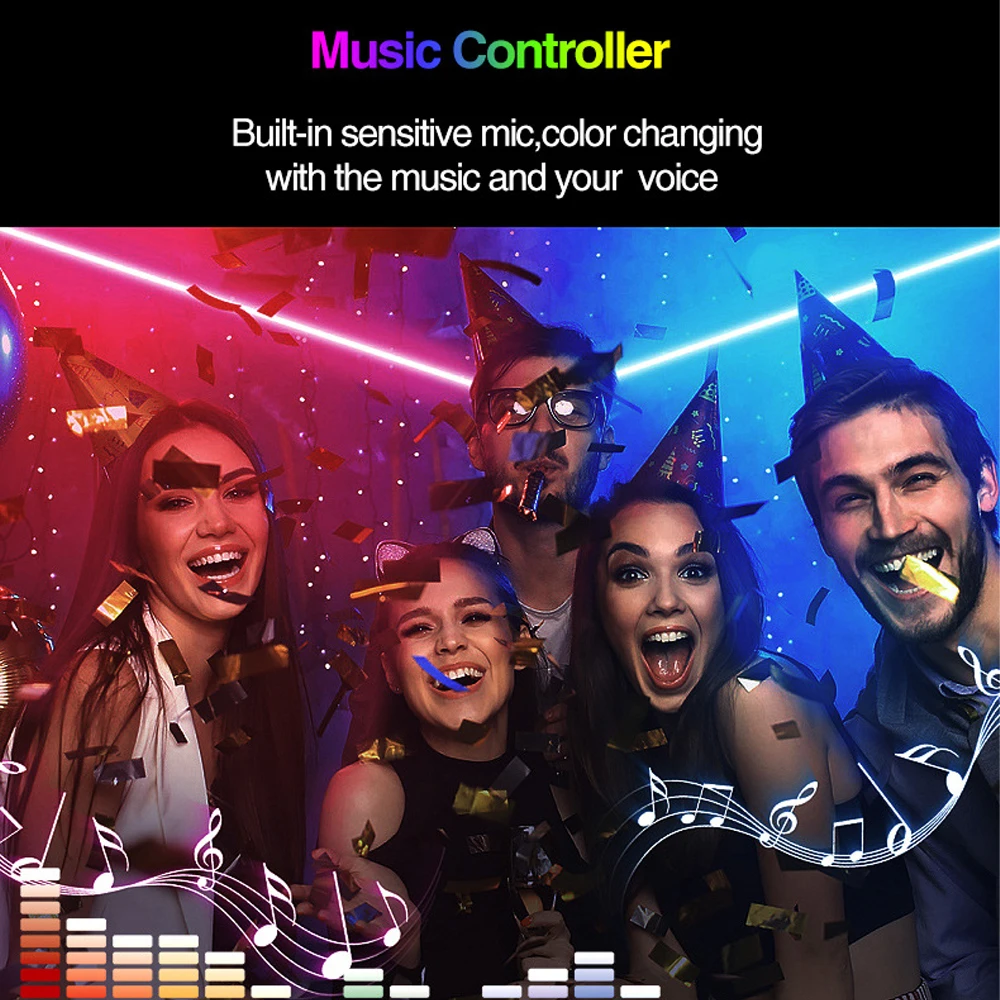 【Два способа использования музыкального режима: 1.APP режим воспроизведения музыки: когда вы носите наушники для прослушивания музыки или не хотите беспокоить своих друзей из-за шумной музыки ночью, вы можете использовать приложение для синхронизации музыки светильник strips.2. Режим микрофона: трехкнопочный Контроллер оснащен звуковым датчиком. Когда у вас есть встреча с семьей или друзьями, вы можете использовать режим микрофона и использовать динамик для воспроизведения музыки. Свет может мигать с ритмом музыки и другого голоса, меняя цвета и струящиеся вспышки