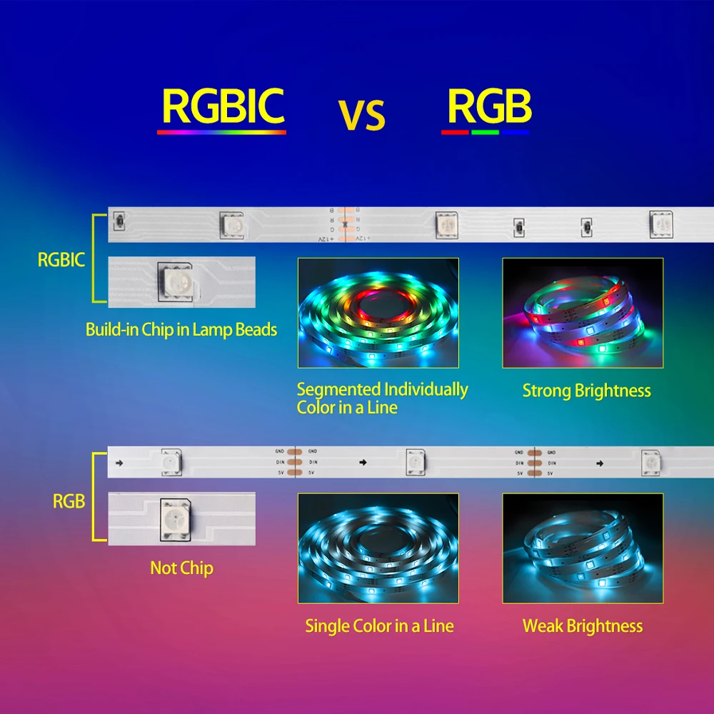 【RGBIC превосходство 】: RGBIC Smart LED strip lights встроенный IC чип, независимо Управляйте светодиодным модулем и одновременно отображайте несколько цветов в одной полосе. Настройка цвета и яркости для каждого сегмента. Вы будете видеть захватывающие цвета постоянно гоняться или течь.
