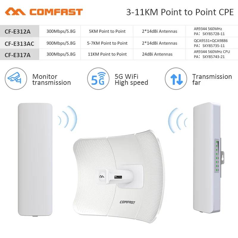 CF-E317A широко используется в приложений точка-точка, точка-Многоточечное и наружное покрытие Wi-Fi. Между тем, его профессиональный структурный дизайн подходит для любых видов тяжелого климата. Таким образом, это идеальный выбор для наружной передачи Wi-Fi на большие расстояния.