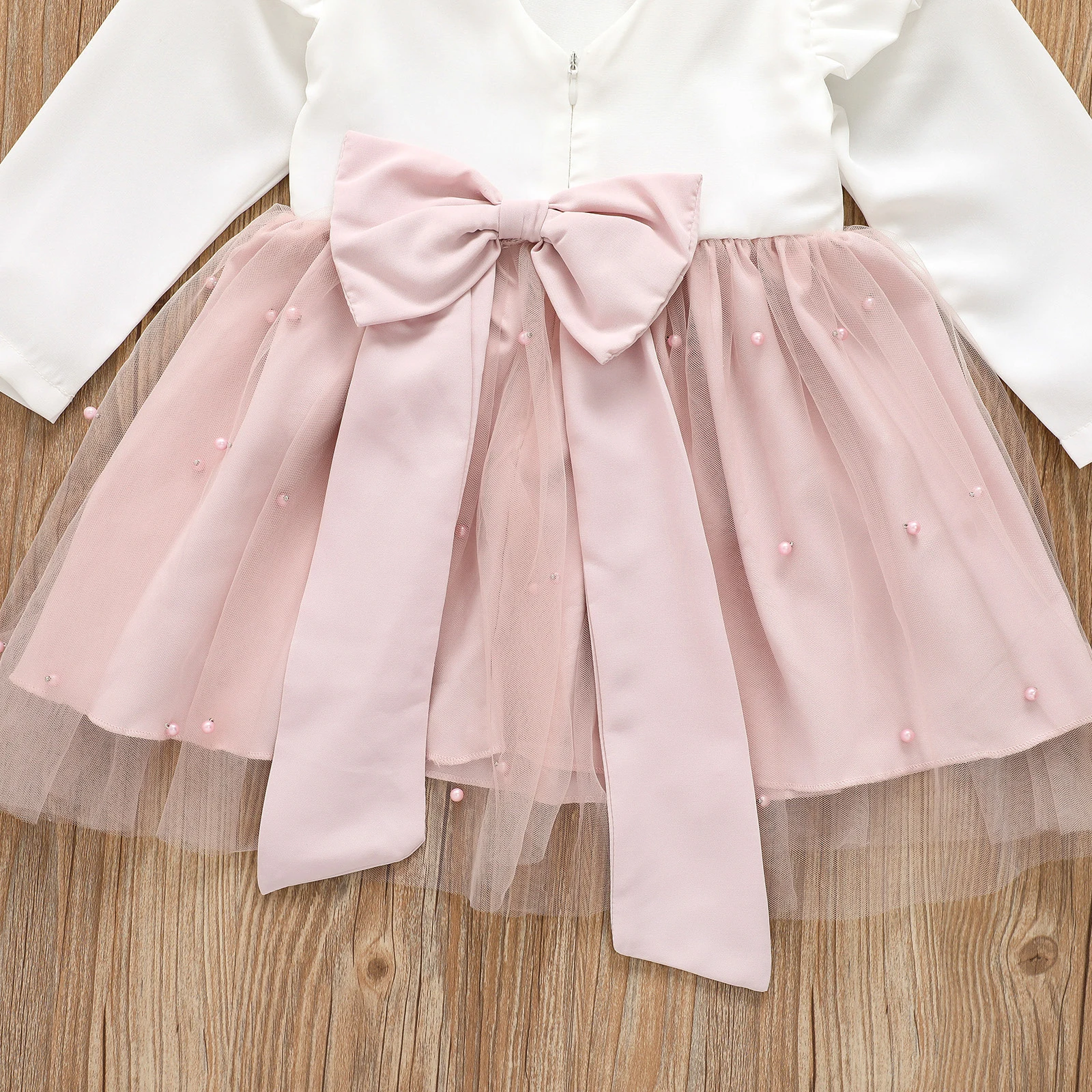 Милое милое платье принцессы для девочек; Детское платье трапециевидной формы с длинными рукавами и бантом сзади; Платье из тюля с жемчужинами; От 1 до 8 лет для вечеринки, дня рождения