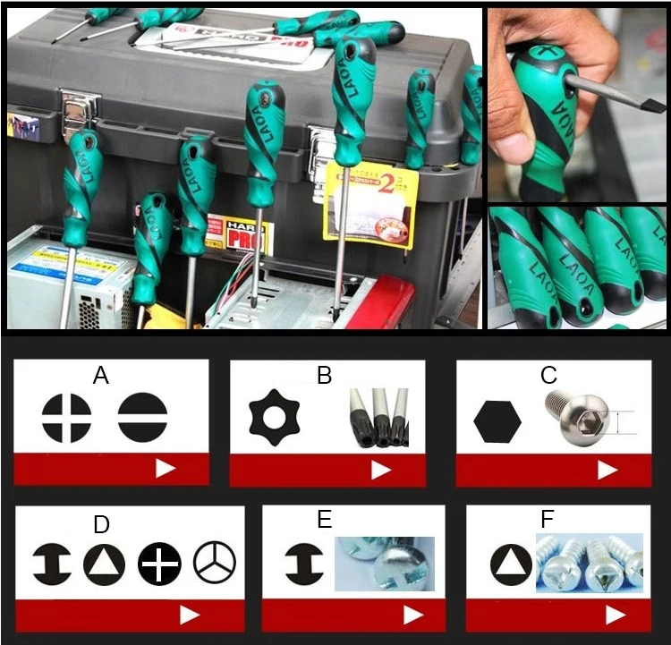 А. Крест и слот B. Торкс с средним отверстием ШестигранныйD. Специальная отвертка E. U Тип 4 шт набор F. Набор из 4 треугольников