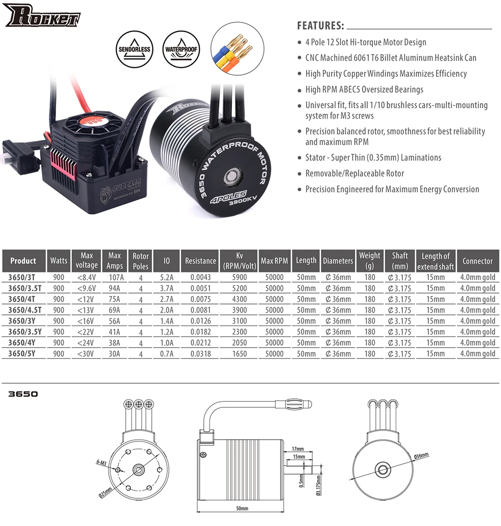 Конструкция двигателя с высоким крутящим моментом, 1,4 полюсов, 12 ячеек.2. Алюминиевый радиатор заготовки 6061 T6, обработанный на станке с ЧПУ.3. Медные обмотки высокой чистоты повышают эффективность. Большие подшипники ABEC5 с высокими оборотами.4. Точность разработана для максимального преобразования энергии.5. Точный сбалансированный ротор, плавность для максимальной надежности и оборотов.6. Универсальная посадка, подходит для всех 1 / 10 бесщеточные автомобили-многомонтажная система для винтов m3.7. Этот профессиональный бесщеточный двигатель SURPASSHOBBY серии 3650 поставляется с высоким качеством. Универсальная посадка, для гоночных внедорожников 2s 1:10 RC Drift, гоночных внедорожников 3s RC Drift.8. Съемный/сменный ротор, точная конструкция для максимального преобразования энергии.Особенности ESC:1. Водонепроницаемый и пыленепроницаемый для любых погодных гонок; (Примечание: пожалуйста, удалите охлаждающий вентилятор перед использованием ESC в воде; очистите и высушите его вскоре после использования, чтобы соединители не заржавели.)2. Специально разработан для радиоуправляемых автомобилей с отличными функциями запуска, ускорения и линейности.3. Совместимость с бессенсорным бесщеточным двигателем.4. Сильная устойчивость к току, отличное рассеивание тепла.5. Множество функций защиты: защита от отключения при низком напряжении для литиевого или никелевого аккумулятора/Защита от перегрева и потери сигнала/Защита от блокировки двигателя/6. Легко программируется и совместим с карманной программной картой.