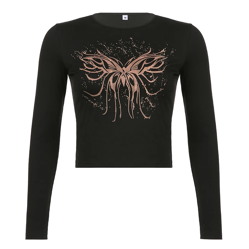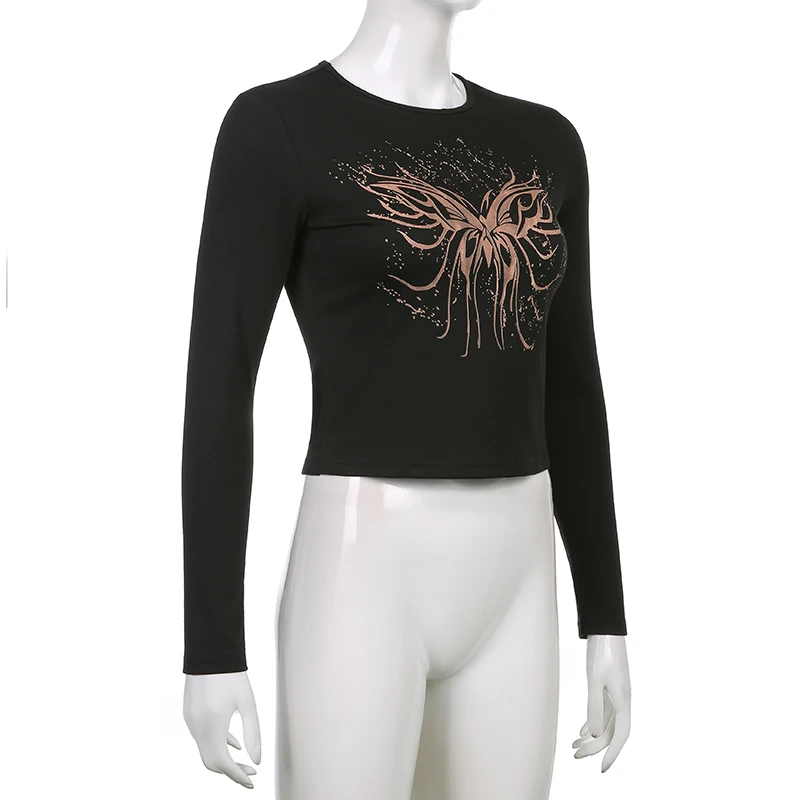 Y2K черная футболка с рисунком бабочки, Осенние облегающие футболки...