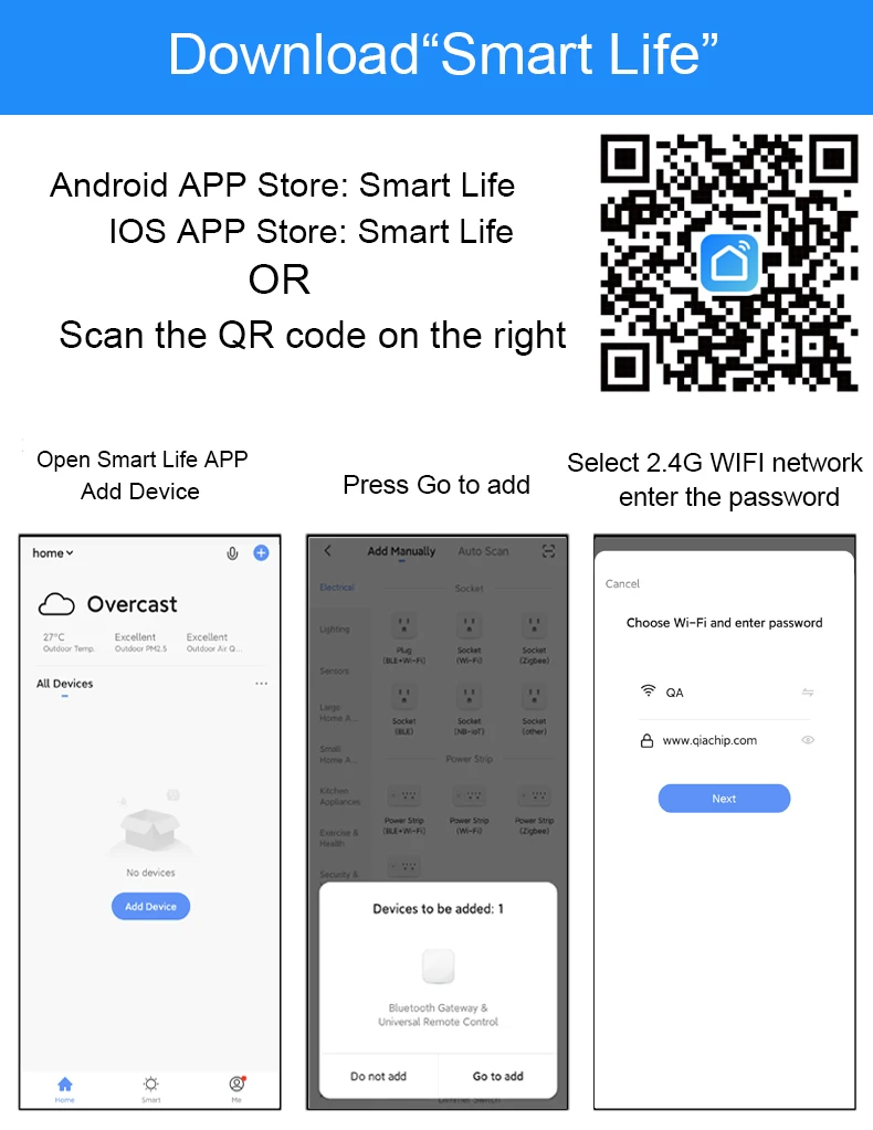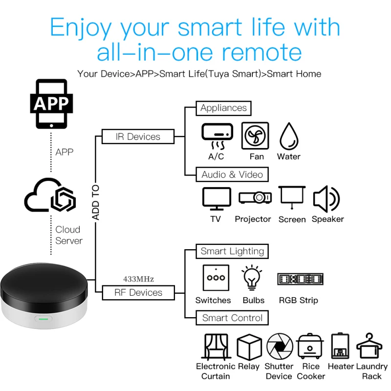 Пульт дистанционного управления AppДистанционное управление бытовой техникой с помощью приложения «Tuya Smart» в вашем мобильном телефоне, где бы вы ни находились. Например: Включите home A/C заранее, наслаждаясь комфортной температурой, как только вы вернетесь домой. Голосовое управлениеПри подключении интеллектуального динамика, такого как Amazon Echo, Google Home, вы можете управлять голосом вашей бытовой техники. Например: Alexa, Включите телевизор; Ок Google, установите температуру кондиционирования воздуха до 25 градусов. Сценарий и автоматизация в приложенииСценарий состоит из 1 или более действий. Создав «Сценарий», вы можете управлять несколькими устройствами одним нажатием; Добавляя «автоматизацию» и взаимодействуя с другими устройствами smart home, пульт дистанционного управления Wi-Fi может выполнять действия автоматически в соответствии с такими условиями, как состояние устройства, погода и время. Imer и Автоматический триггерСогласно вашим привычкам жизни, установите переключатели времени для вашей бытовой техники, такие как включение/выключение кондиционера через регулярные промежутки времени. Сделай СамНастройка кнопок в умном приложении Tuya, если ваш бренд бытовой техники не входит в список или не поддерживается. Третий-вечерние контроль:Работает с Amazon Alexa, Google Assistant, Siri(iOS 12,0 или более поздней версии), Tmall Genie, Tecent Xiaowei, DingDong, Rokid, DuerOS и т. д.* Дружеское напоминание: не работает с IFTTT.