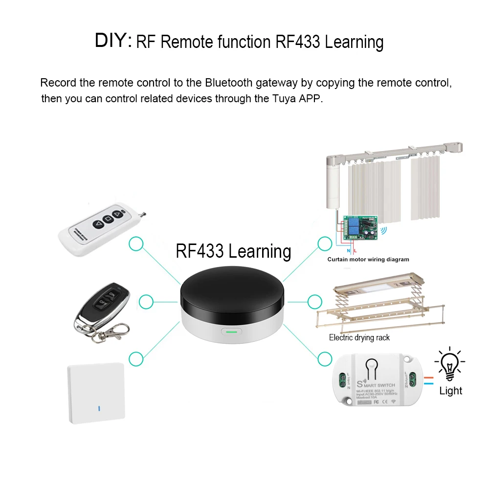 Умный шлюз Bluetooth имеет функцию копирования, которая может копировать пульт дистанционного управления чипом частоты RF433 EV1527 для удаленного управления коммутационным оборудованием RF433.