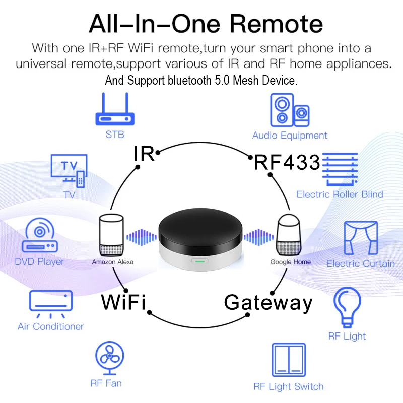 Умный шлюз bluetooth buit в универсальном ИК-пульте дистанционного управления и RF433, вы можете использовать свой мобильный телефон для управления бытовой техникой, такой как STB (телеприставка), TV Box, TV, кондиционер, вентилятор, DVD и т. Д. Совместимость с большинством брендов на рынке, для подробной информации, Пожалуйста, обратитесь к списку поддерживаемых брендов в приложении. Кроме того, у него есть функция обучения, Позволяет Копировать функцию ключа оригинального пульта дистанционного управления в приложение (Настройка кнопок в умном приложении Tuya). Вы также можете скопировать пульт дистанционного управления RF433 для реализации продукта, который контролирует беспроводной пульт дистанционного управления RF433. Функция bluetooth-шлюза позволяет подключать умные переключатели и умные устройства Bluetooth MESH SIG.