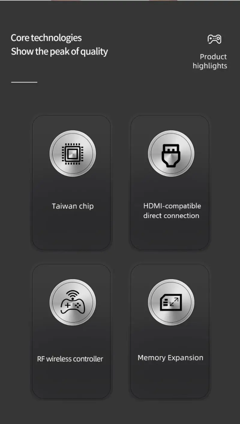 1 × игровая консоль, 2 × игровой контроллер, 1 × HDMI-совместимый удлинитель, 1 × USB кабель, 1 × руководство пользователя, 1 × tf-карта (32G/64G/без tf-карты (опционально)