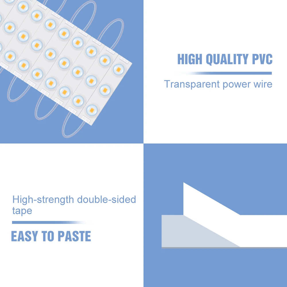 * Один модуль имеет длину 6,5 см, расстояние между двумя модулями составляет 9 см, каждый модуль имеет 3 лампочки, а характеристики продукта-2/6/10/14 модулей.