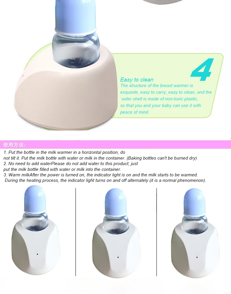 Подходит для разогрева различных типов бутылок молока и детского питания, таких как молоко, каша, рисовые зерна и т. Д. Температура нагрева обычно контролируется в диапазоне от 35 °C до 45 °C. Убедитесь, что пища не кипела и не уничтожает Оригинальное питание.
