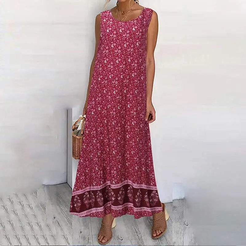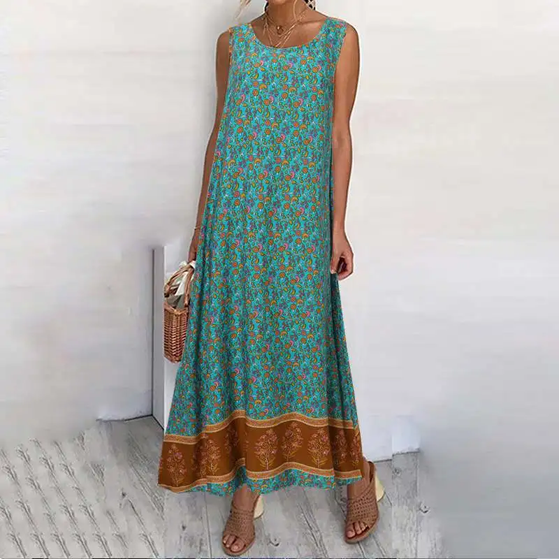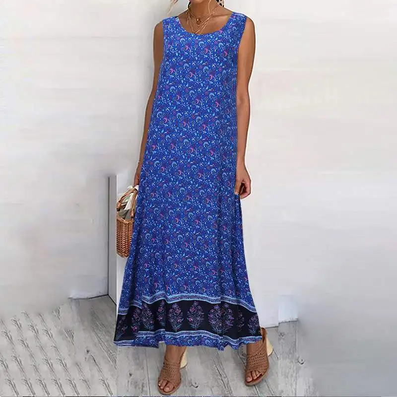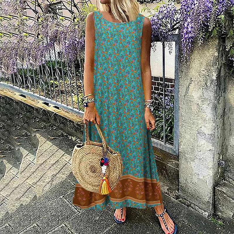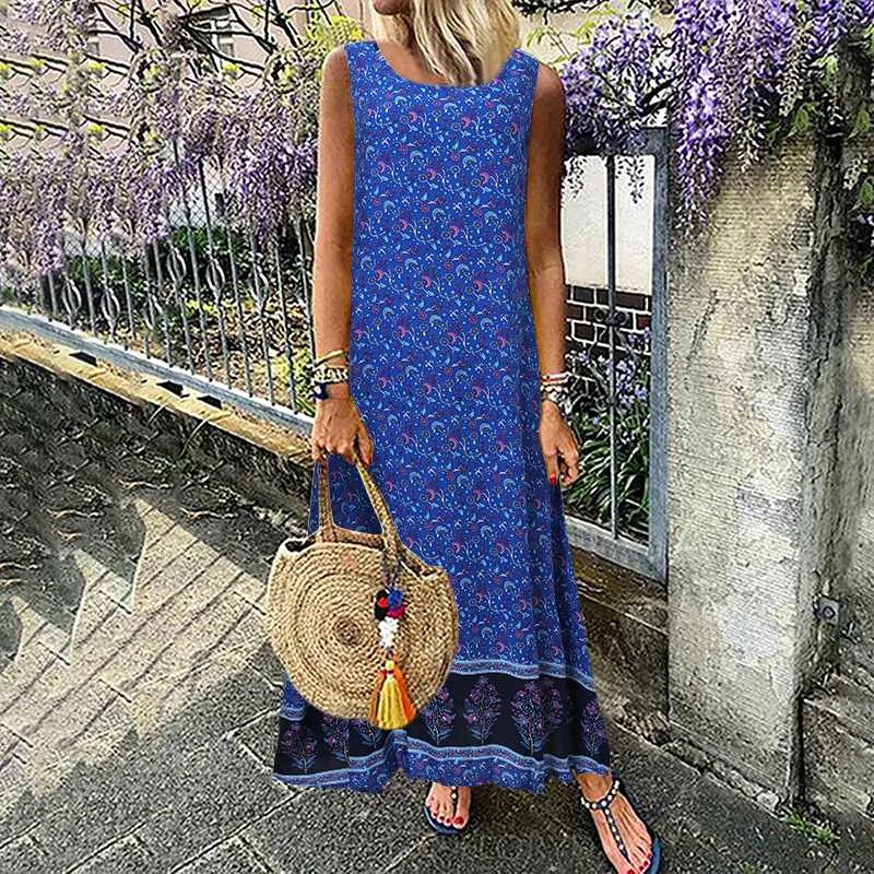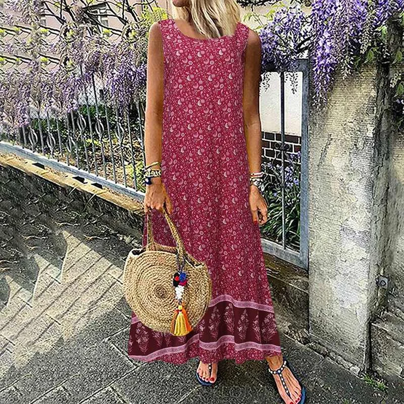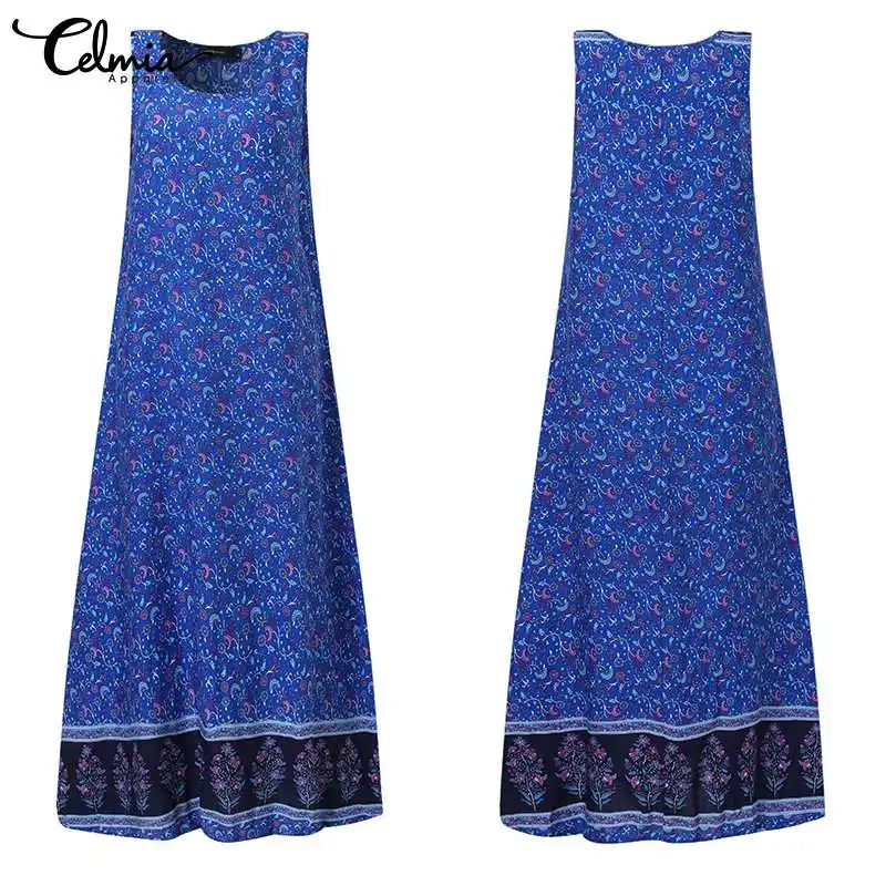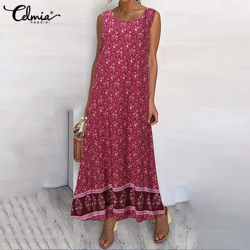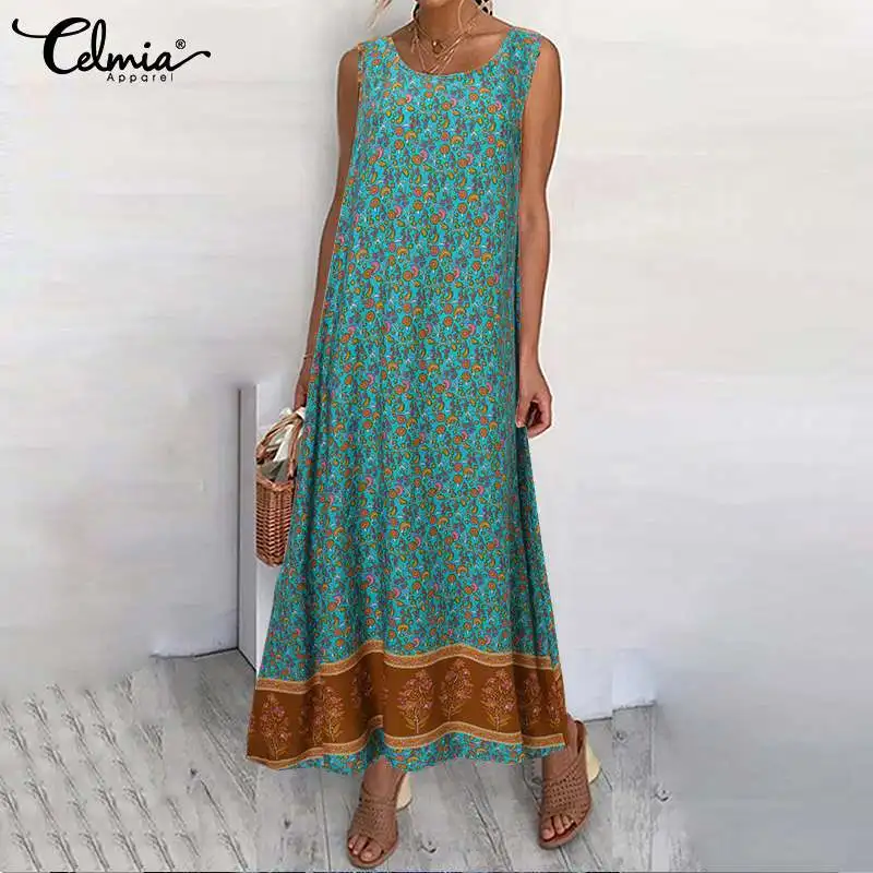 Богемное женское пляжное платье Celmia, лето 2021, праздничное платье макси без рукавов, повседневное длинное платье, Женский винтажный сарафан с цветочным принтом
