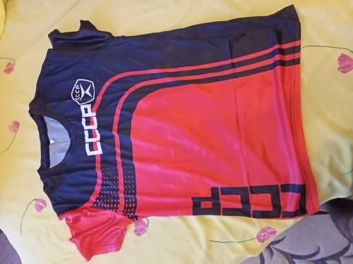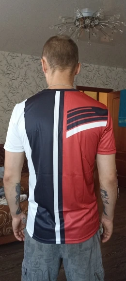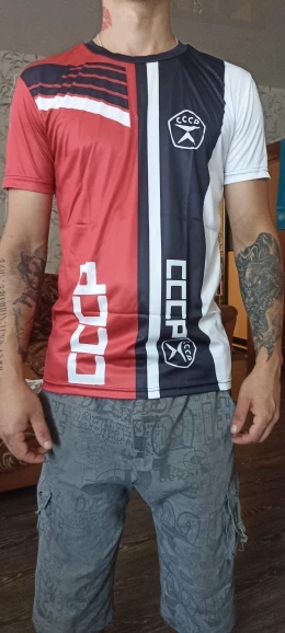 Внешне выглядит очень хорошо. Принт качественный. Но материал ужасный. 100% синтетика, спина за 5 минут вся мокрая и мокрота не сохнет, ибо материал не пропускает воздух. это не спортивная синтетическая ткань которая дышит. в ней как в пакете очень жарко.