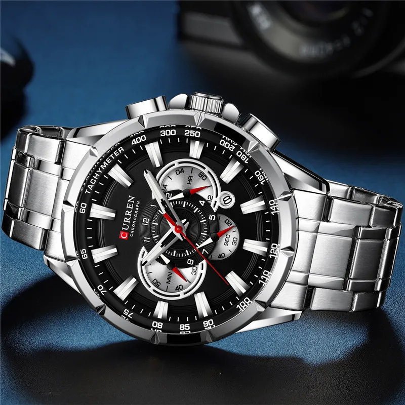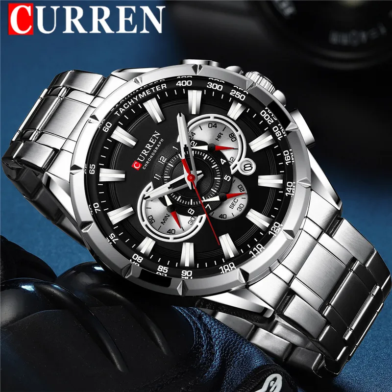 Часы наручные CURREN Мужские с хронографом, водонепроницаемые брендовые Роскошные спортивные Серебристые в стиле милитари, из нержавеющей стали, 8363