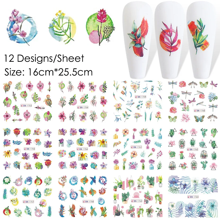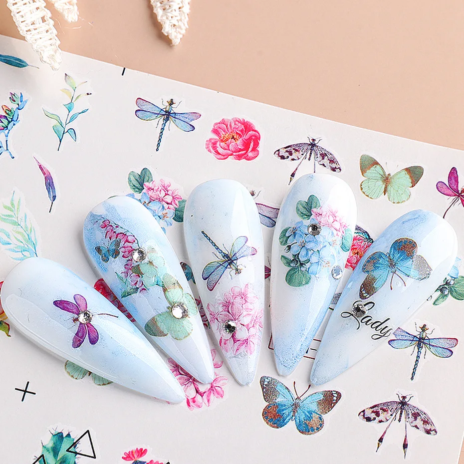 12 шт. наклейки для ногтей дизайн 2021 Цветочные маленькие цветочные стрекозы накладные ногти наклейки летние свежие Переводные водяные знаки набор слайдеров для ногтей