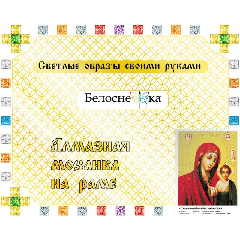 Торговая марка Белоснежка предлагает Вам серию наборов для творчества легких образов своими руками. Воспроизведите удивительные изображения сияющих православных икон на картинке, собранной из блестящих и переливающихся мелких ограненных камней. Простые действия приведут к потрясающему результату и радости за исход их работы, нужно просто отвернуться от суеты, очистить свои мысли и коснуться истории. Выкладка Икон-это отдых для души и связь с православными традициями. Готовая работа-прекрасный подарок для каждой семьи и близких. Все иконы-копии знаменитых лиц православных святых, написанных по всем церковным канонам.
