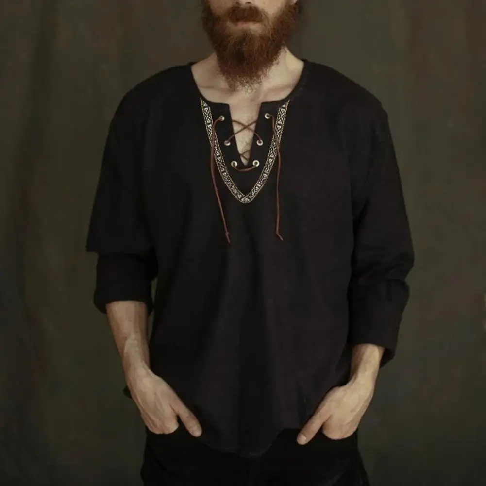 Мужская тонкая рубашка, Повседневная дышащая рубашка с длинным рукавом и шнуровкой спереди, в стиле викингов, винтажный пуловер, 2021