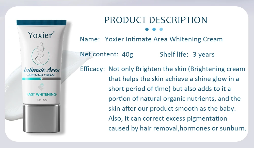 Название: отбеливающий крем для интимной зоны YoxierСодержание нетто: 40 гСрок годности: 3 годаЭффективность: не только осветляет кожу (Осветляющий крем, который помогает коже достичь блеска светится в течение короткого периода времени), но и добавляет ей часть натуральных органических питательных веществ, И кожа после того, как наш продукт гладкий, как ребенок. Кроме того, это может исправить избыточную пигментацию, вызванную удалением волос, гормонами или солнечными ожогами.