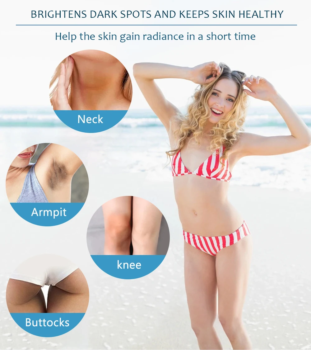Осветляет темные пятна и сохраняет кожу здоровойПомогает коже получить сияние за короткое времяШея/подмышка/колено/ягодицы