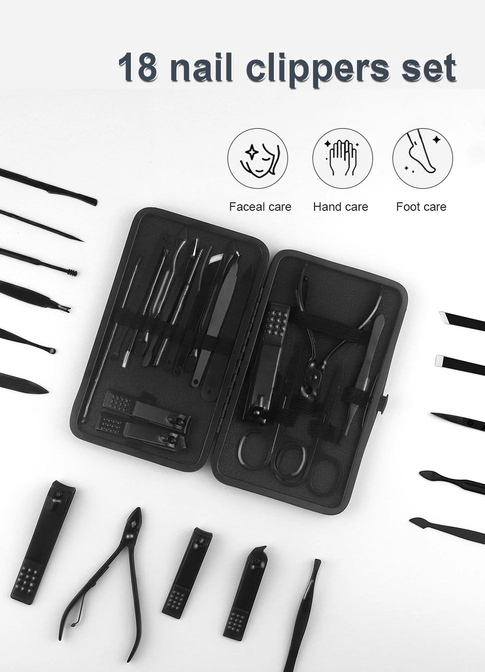 Профессиональный маникюрный набор содержит 18 инструментов для ногтей и ногтей для ног для трех функций, включая уход за руками, уход за лицом и уход за ногами. Этот набор для маникюра и педикюра имеет все, что вам нужно.