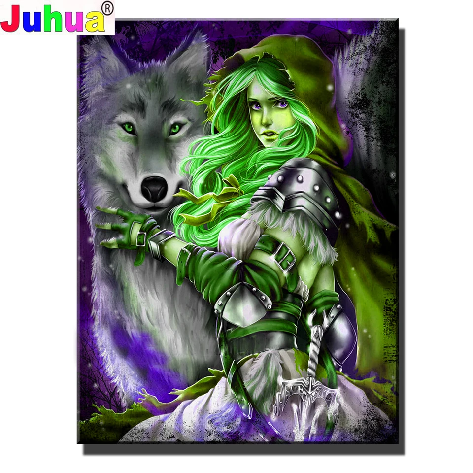 Фантазия девушка и волк Алмазная картина вышивка крестиком полный квадратный Круглый Алмаз Вышивка Зеленая Леди животное кристалл набор, настенное искусство