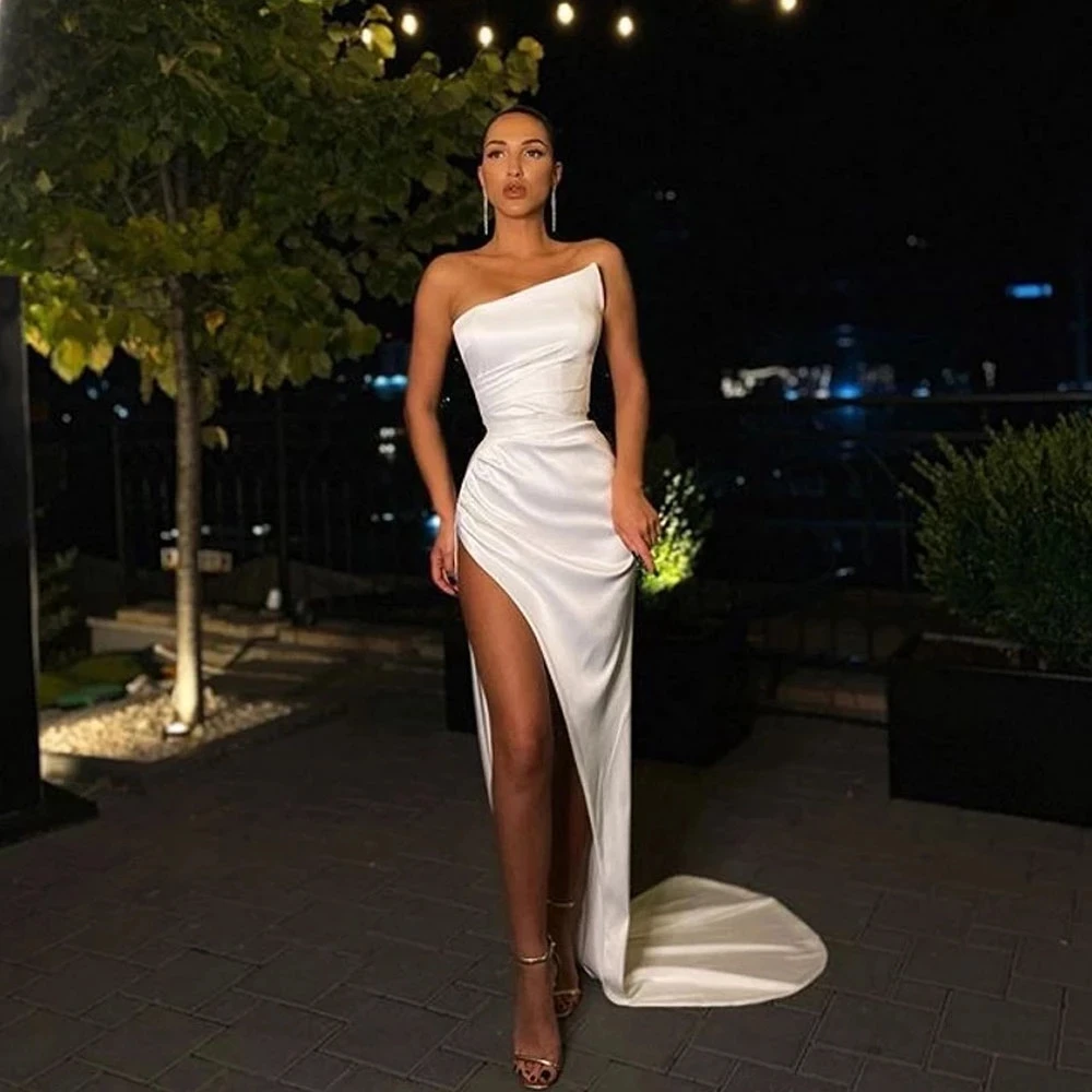 Соблазнительные Формальные Вечерние платья-футляры 2021, с высоким разрезом сбоку, без бретелек, без рукавов, с оборками, атласные пуховики для выпускного вечера, Vestidos De Fiesta, на заказ