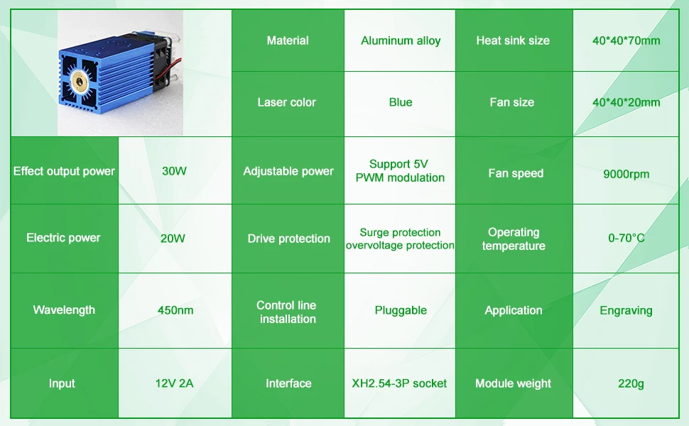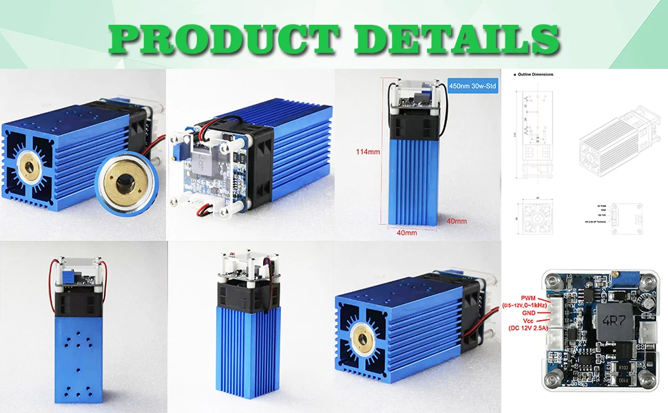 Синий лазерный модуль специально разработан для фрезерного станка с ЧПУ и гравировки DIY. Длина волны составляет 450нм, что является эффективным инструментом для лазерной гравировки и резки. Они могут гравировать и резать различные материалы.Характеристика:Синий лазерный модуль --- профессиональная лазерная головка с высокой скоростью и высокой стабильностью. Яркий синий светильник, легко найти при резке.Лазерная головка с фиксированным фокусом, подходит для трехосевой гравировальной машины, легко устанавливается.Легко собрать --- маленький, компактный, удобный и простой в установке.40 Вт резной материал --- дерево, бумага, кожа, бамбук, пластик, резина, алюминий, нержавеющая сталь, медь и т. д.Спецификация:Выходная мощность эффекта: 40W-Pro / 30W-Std (опционально)Материал: алюминиевый сплав + пластикСветильник Цвет: синийДлина волны: 450нмФорма точки: пунктиформа, фиксированный фокусВходное напряжение: 12 В 2 АПараметры интерфейса: Поддержка TTL сигнала управления питаниемРазмер изделия: 12*4*4 смРазмер упаковки: 14*6,2*6,2 смВес изделия: 300 гУпаковочный лист:1 * лазерная головка