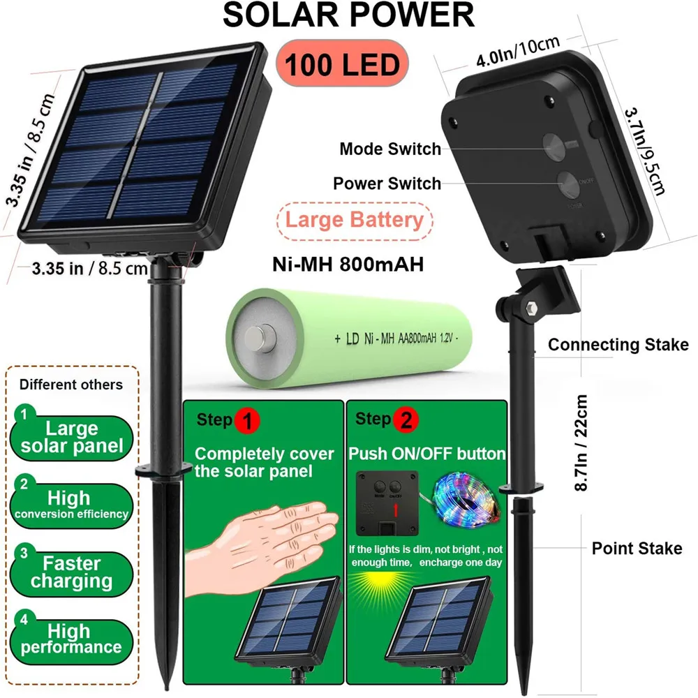 ● Простота установки. Кабель не требуется● Без затрат на электроэнергию. Лампа заряжается солнечной панелью под солнечным светом. Поэтому Замена батареи не является необходимой.● Два режима воспроизведения света. Вспышка и устойчивый свет.● Длина в гирляндой: 12 м (в том числе 2 м свинцовая линия), светодиодный количество 100; 7 м (в том числе 2 м свинцовая линия), светодиодный количество составляет 50.● Расстояние между двумя светодиодный свет: 10 см● Водонепроницаемый. IP65, подходит для наружного применения.● Гибкая лента для изгиба● Яркий, но работает при низкой температуре● С датчиком на светильник. Сказочные огни автоматически включаются в темноте и выключаются на рассвете.● Низкое напряжение. Рабочее напряжение 1,2 Вольт. Безопасно использовать в местах, где вы можете прикоснуться.● Продолжительность освещения:> 12 часов (при полной зарядке), время зарядки: не менее 8 часов при солнечном свете.