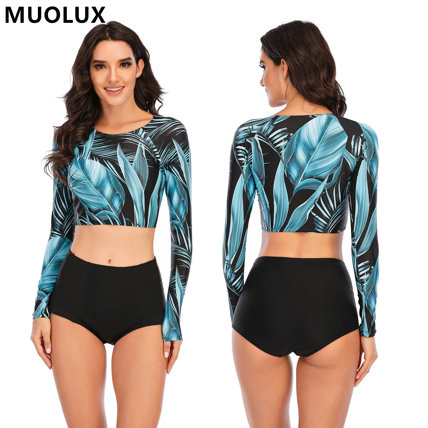 Женский купальник для серфинга, новинка 2022, комплект бикини с длинным рукавом, купальник с листьями, пуш-ап, летний купальный костюм из двух предметов, бикини-бандо