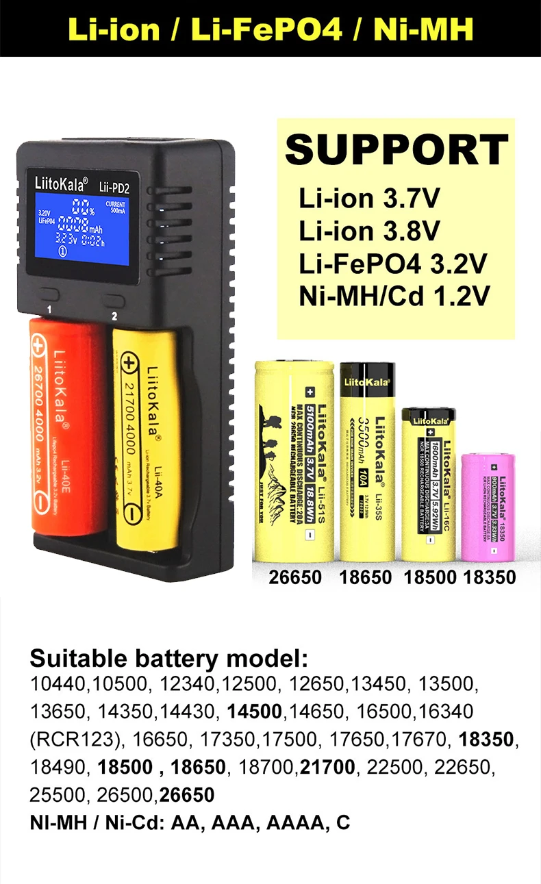 Зарядное устройство LiitoKala для аккумуляторов 18650, литиевых, NiMH аккумуляторов 26650, 21700, 18350, 14500, AA, AAA, 3,7 в1,2 в, зарядное устройство с ЖК-дисплеем, USB-тестирование