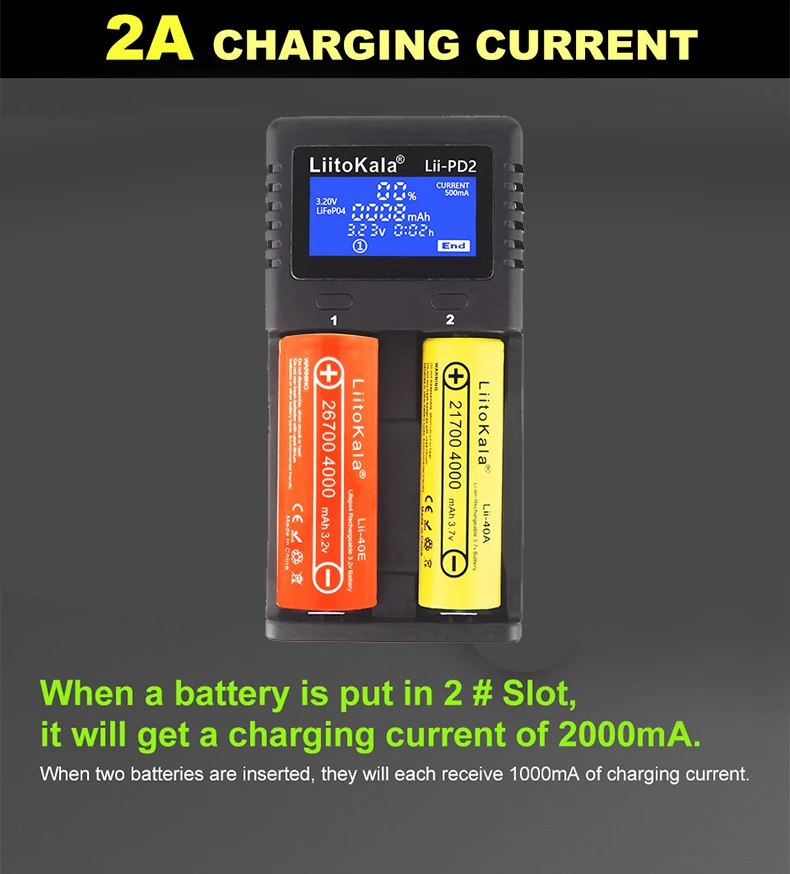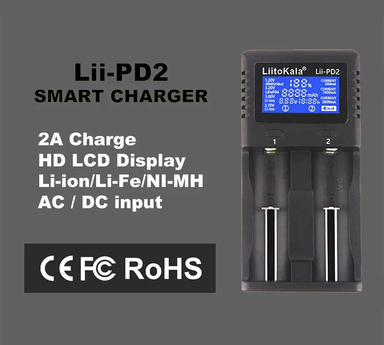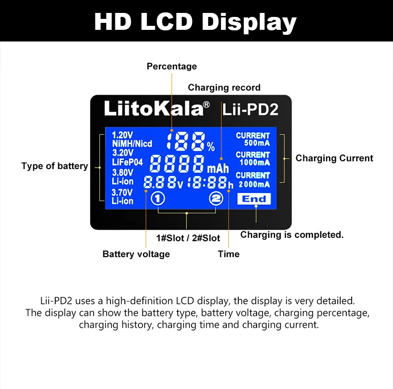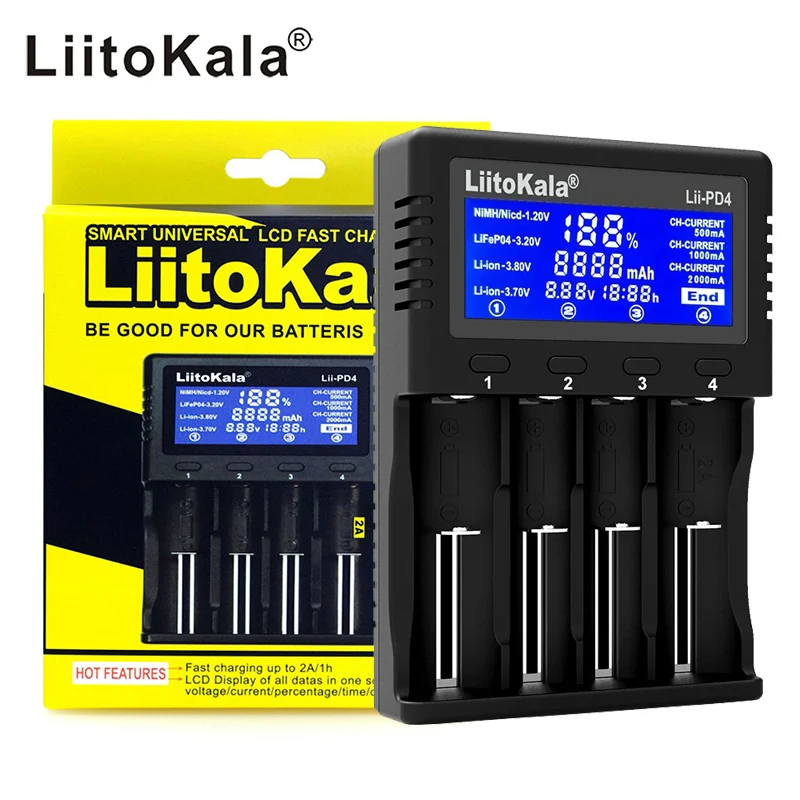 -ЖК-дисплей smart-4 слота работают независимо-Множественная защита-3 зарядный ток (500мА/1000мА/2000ма)-Функция активации напряжения 0 В-Интеллектуальное распознавание литиевой батареи (li-ion)/0 никель-металлогидридный гидрид (NiMH/Cd) батарея