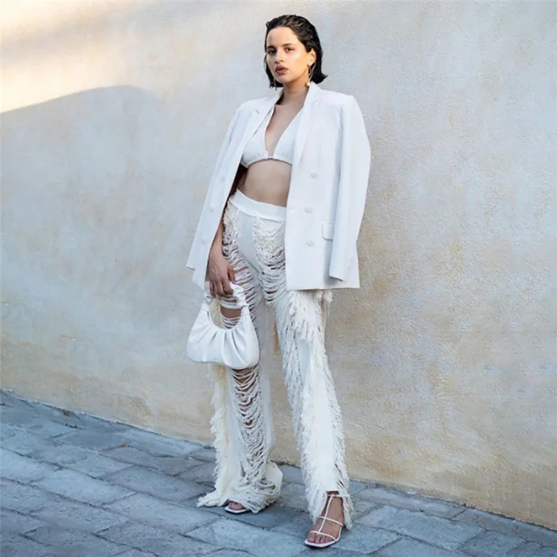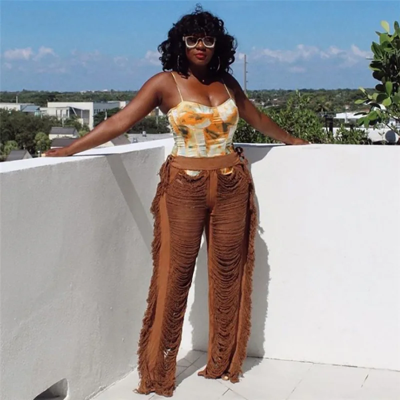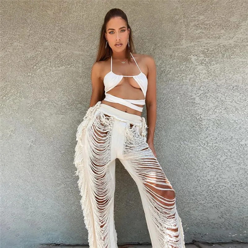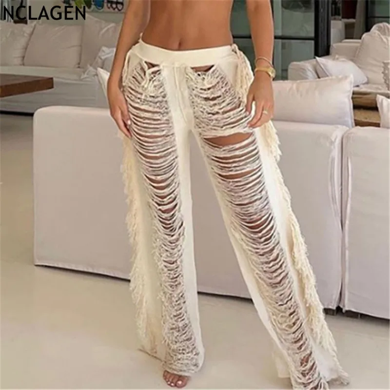 NCLAGEN 2021 сексуальные рваные вязаные женские брюки с кисточками по бокам уличная мода брюки женские для вечерние Клубные шикарные Капри