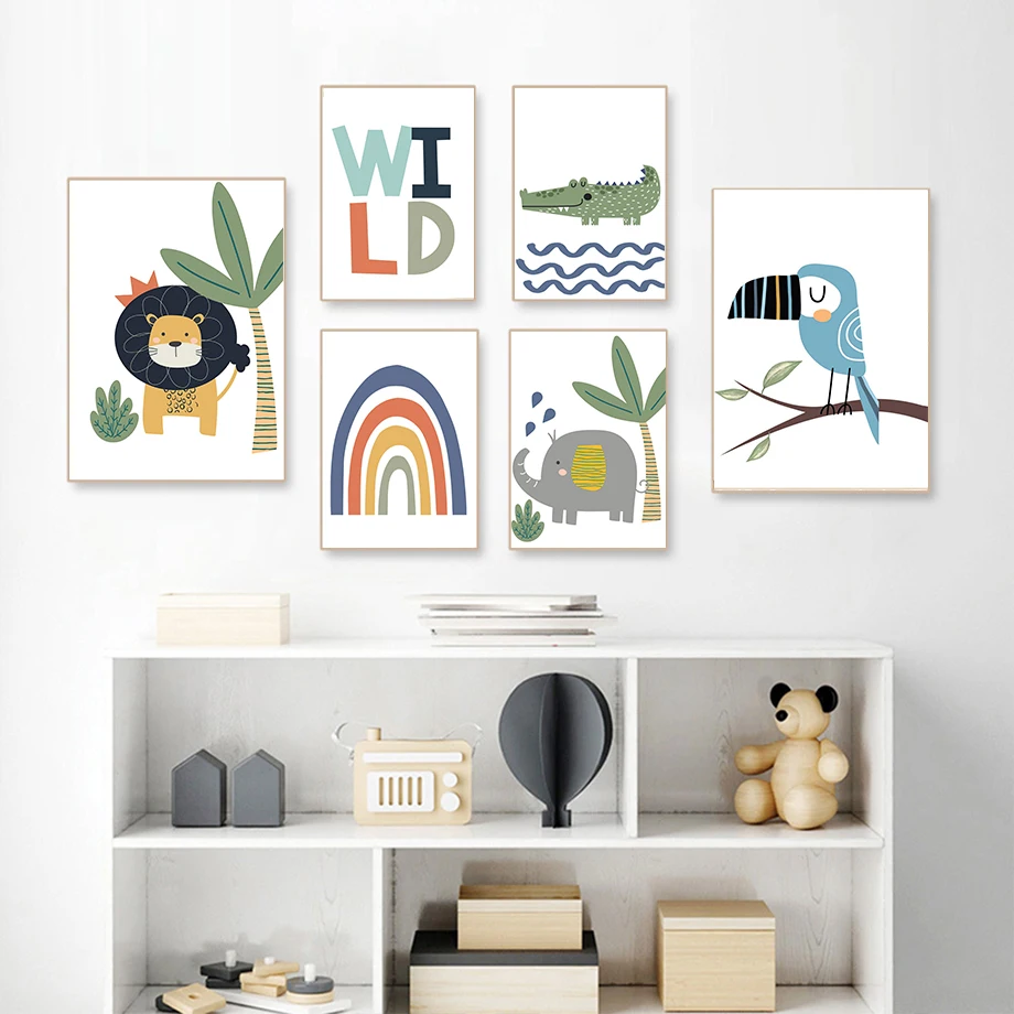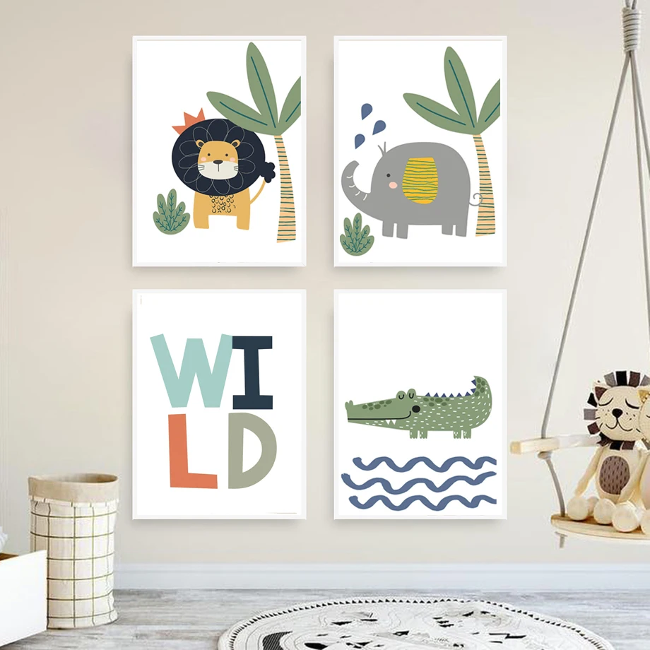 Лев леопард слон жираф листья детская настенная Картина на холсте с...