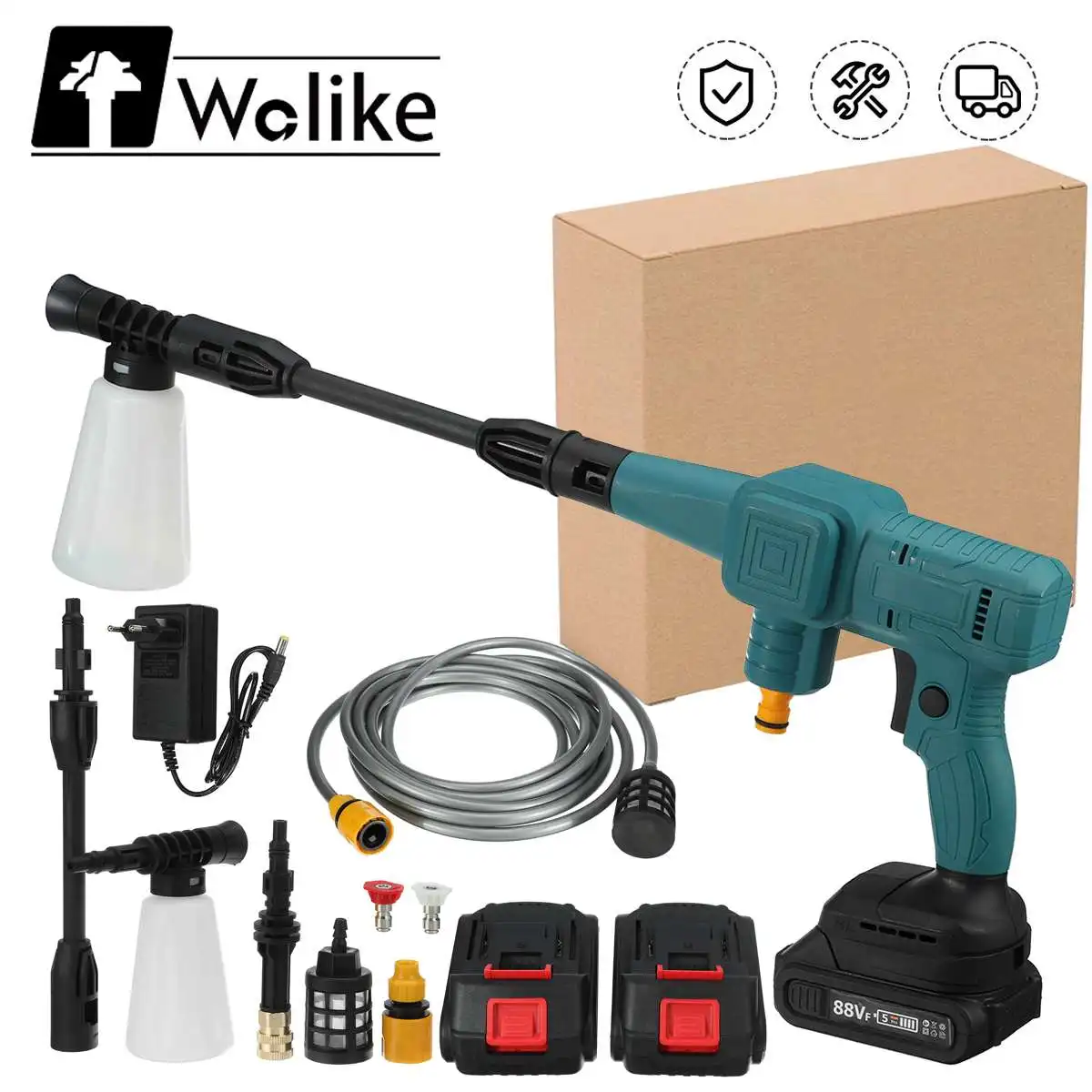 Посылка:1 х мойка высокого давления1/2 x батареяЗарядное устройство-1 шт.1 х 5 м Водопровод1 х пенопласт1 х соединитель смесителя2 разъема2 х головка для водыМеталлический фильтр-1 шт.1 х труба