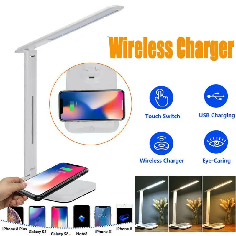 Светодиодная настольная лампа 10 Вт с беспроводным зарядным устройством QI, офисный складной офисный светильник с регулируемой яркостью и функцией заряда для телефона, новый дизайн