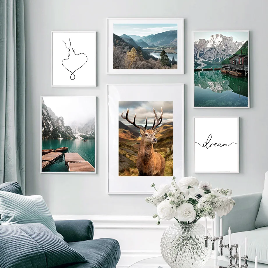 Настенная картина с изображением леса, оленя, гор, озера, лодки, абстрактные линии, постеры и принты на холсте в скандинавском стиле, декоративные картины для гостиной